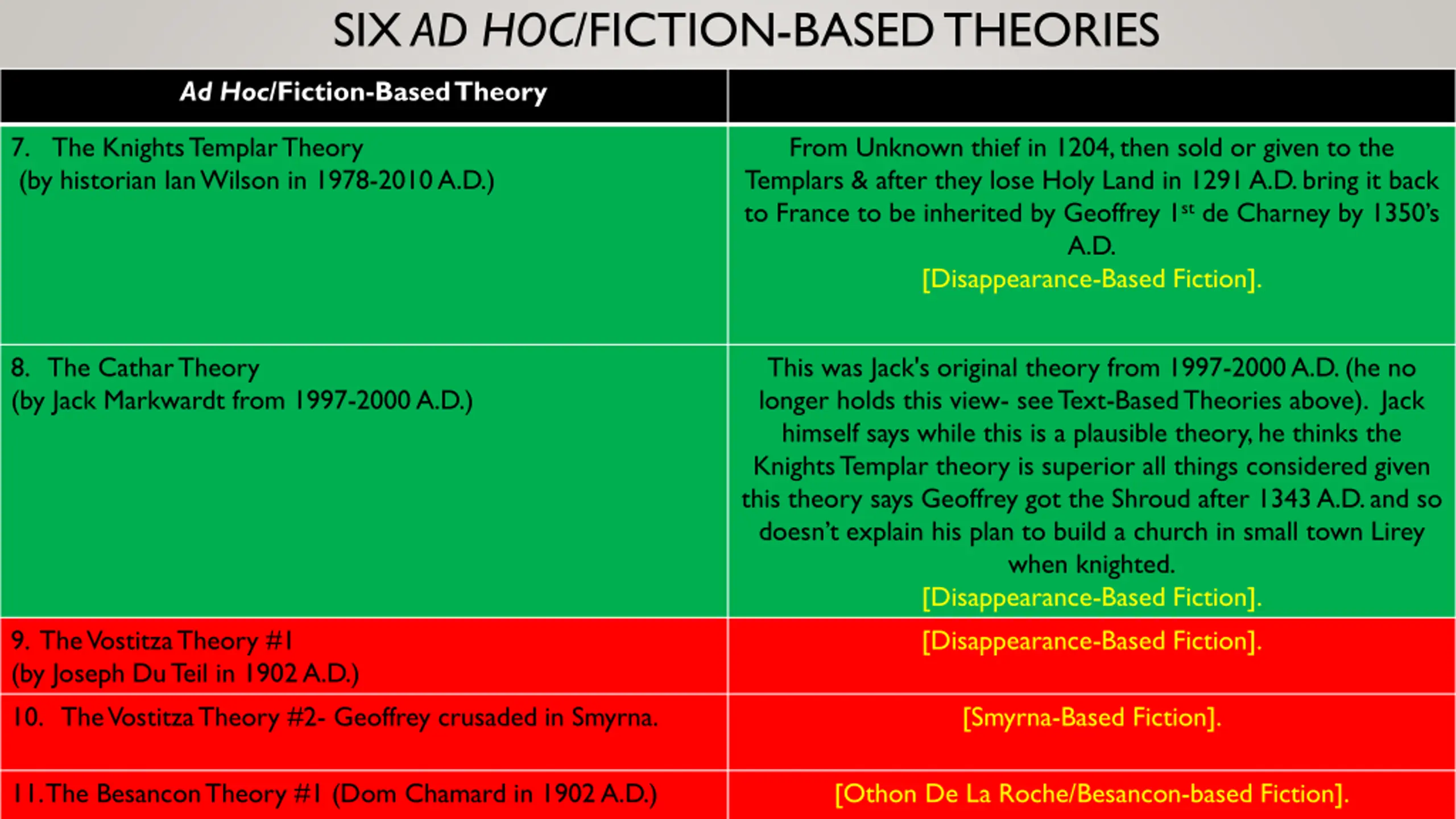 SIXAD HOC/FICTION-BASED THEORIES Ad Hoc/Fiction-Based Theory 7. The Knights Templar Theory (by historian Ian Wilson in 1978-2010 A.D.) From Unknown thief in 1204, then sold or given to the Templars & after they lose Holy Land in 1291 A.D. bring it back to France to be inherited by Geoffrey 1stde Charney by 1350 s A.D. [Disappearance-Based Fiction]. 8. The Cathar Theory (by Jack Markwardt from 1997-2000 A.D.) This was Jack's original theory from 1997-2000 A.D. (he no longer holds this view- see Text-Based Theories above). Jack himself says while this is a plausible theory, he thinks the Knights Templar theory is superior all things considered given this theory says Geoffrey got the Shroud after 1343 A.D. and so doesn t explain his plan to build a church in small town Lirey when knighted. [Disappearance-Based Fiction]. [Disappearance-Based Fiction]. 9. The VostitzaTheory #1 (by Joseph Du Teil in 1902 A.D.) 10. The VostitzaTheory #2- Geoffrey crusaded in Smyrna. [Smyrna-Based Fiction]. 11. The Besancon Theory #1 (Dom Chamard in 1902 A.D.) [Othon De La Roche/Besancon-based Fiction].