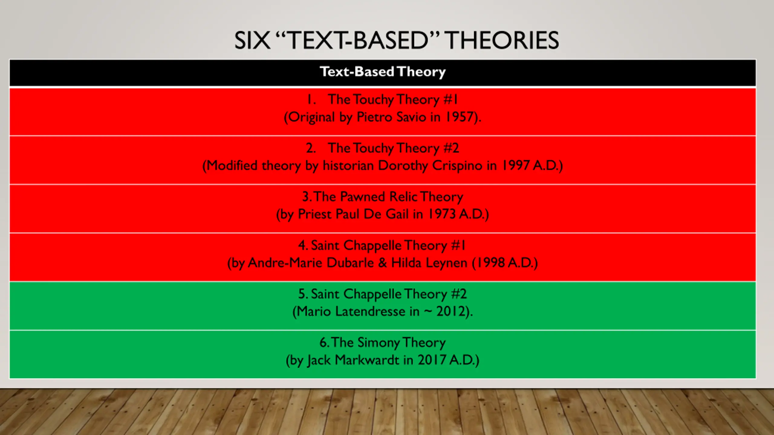 SIX TEXT-BASED THEORIES Text-Based Theory 1. The Touchy Theory #1 (Original by Pietro Savio in 1957). 2. The Touchy Theory #2 (Modified theory by historian Dorothy Crispino in 1997 A.D.) 3. The Pawned Relic Theory (by Priest Paul De Gail in 1973 A.D.) 4. Saint Chappelle Theory #1 (by Andre-Marie Dubarle & Hilda Leynen (1998 A.D.) 5. Saint Chappelle Theory #2 (Mario Latendresse in ~ 2012). 6. The Simony Theory (by Jack Markwardt in 2017 A.D.)