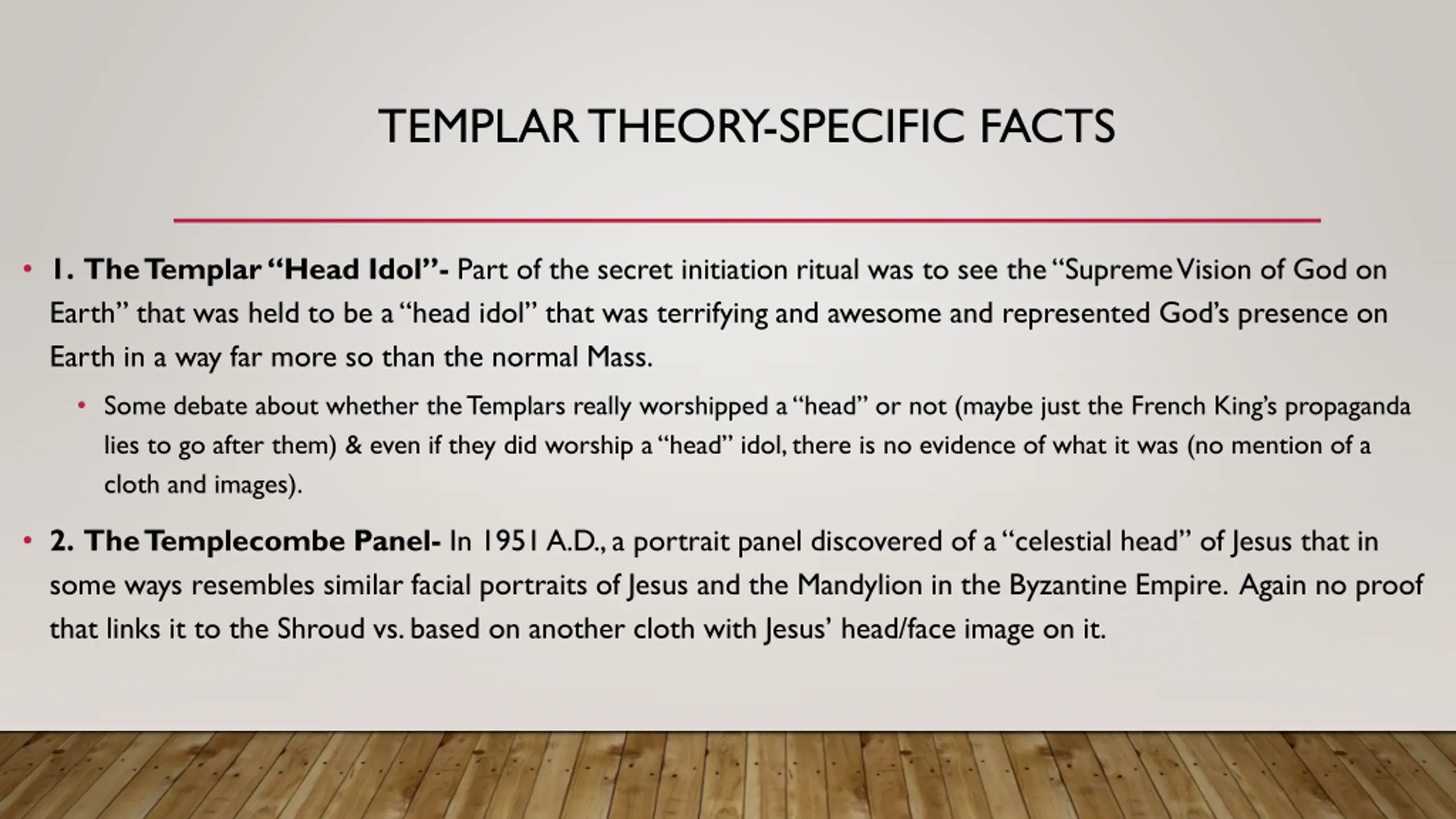 TEMPLAR THEORY-SPECIFIC FACTS 1. The Templar Head Idol - Part of the secret initiation ritual was to see the Supreme Vision of God on Earth that was held to be a head idol that was terrifying and awesome and represented God s presence on Earth in a way far more so than the normal Mass. Some debate about whether the Templars really worshipped a head or not (maybe just the French King s propaganda lies to go after them) & even if they did worship a head idol, there is no evidence of what it was (no mention of a cloth and images). 2. The Templecombe Panel- In 1951 A.D., a portrait panel discovered of a celestial head of Jesus that in some ways resembles similar facial portraits of Jesus and the Mandylion in the Byzantine Empire. Again no proof that links it to the Shroud vs. based on another cloth with Jesus head/face image on it.