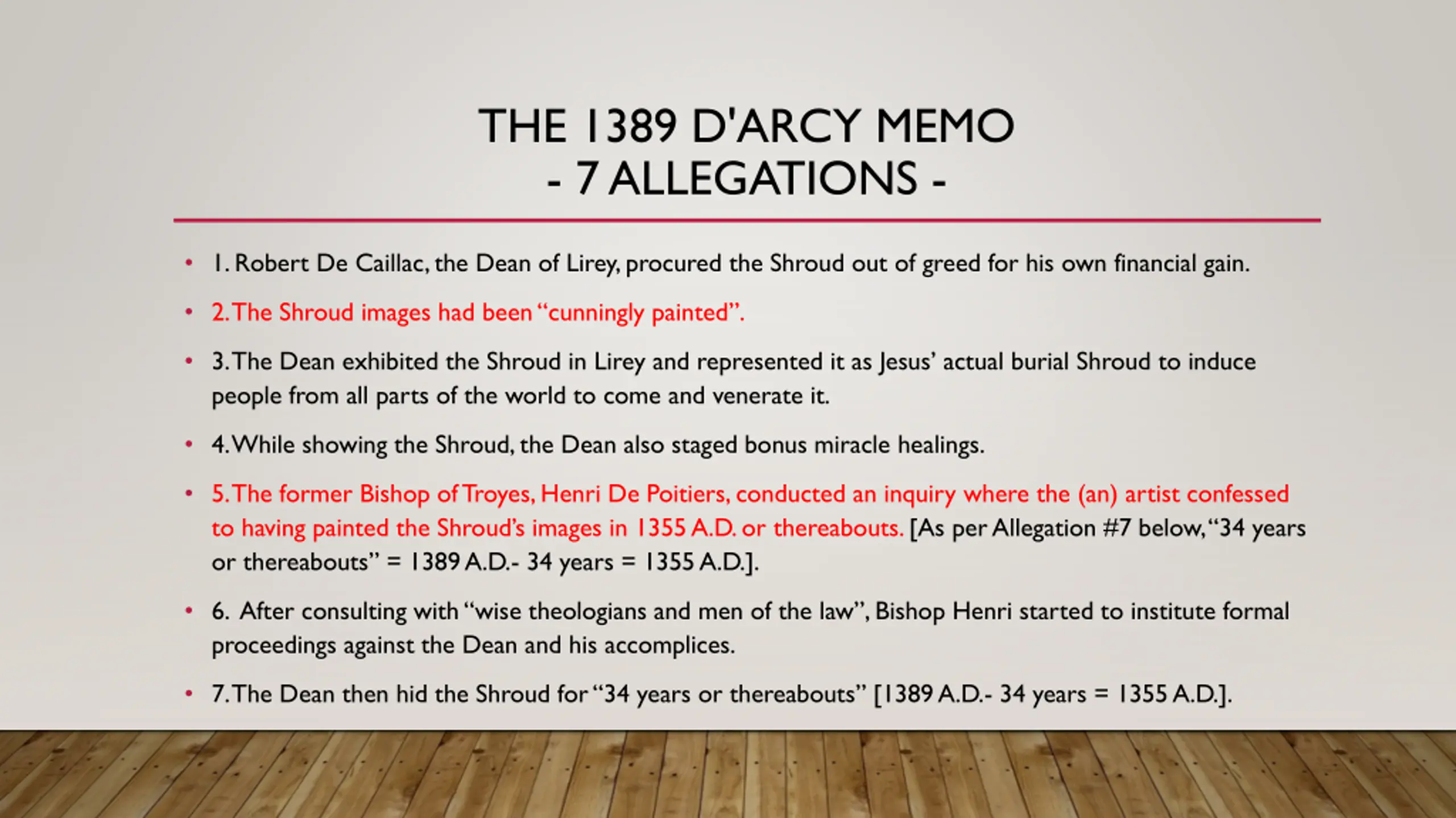 THE 1389 D'ARCY MEMO - 7 ALLEGATIONS - 1. Robert De Caillac, the Dean of Lirey, procured the Shroud out of greed for his own financial gain. 2. The Shroud images had been cunningly painted . 3. The Dean exhibited the Shroud in Lirey and represented it as Jesus actual burial Shroud to induce people from all parts of the world to come and venerate it. 4. While showing the Shroud, the Dean also staged bonus miracle healings. 5. The former Bishop of Troyes, Henri De Poitiers, conducted an inquiry where the (an) artist confessed to having painted the Shroud s images in 1355 A.D. or thereabouts. [As per Allegation #7 below, 34 years or thereabouts = 1389 A.D.- 34 years = 1355 A.D.]. 6. After consulting with wise theologians and men of the law , Bishop Henri started to institute formal proceedings against the Dean and his accomplices. 7. The Dean then hid the Shroud for 34 years or thereabouts [1389 A.D.- 34 years = 1355 A.D.].