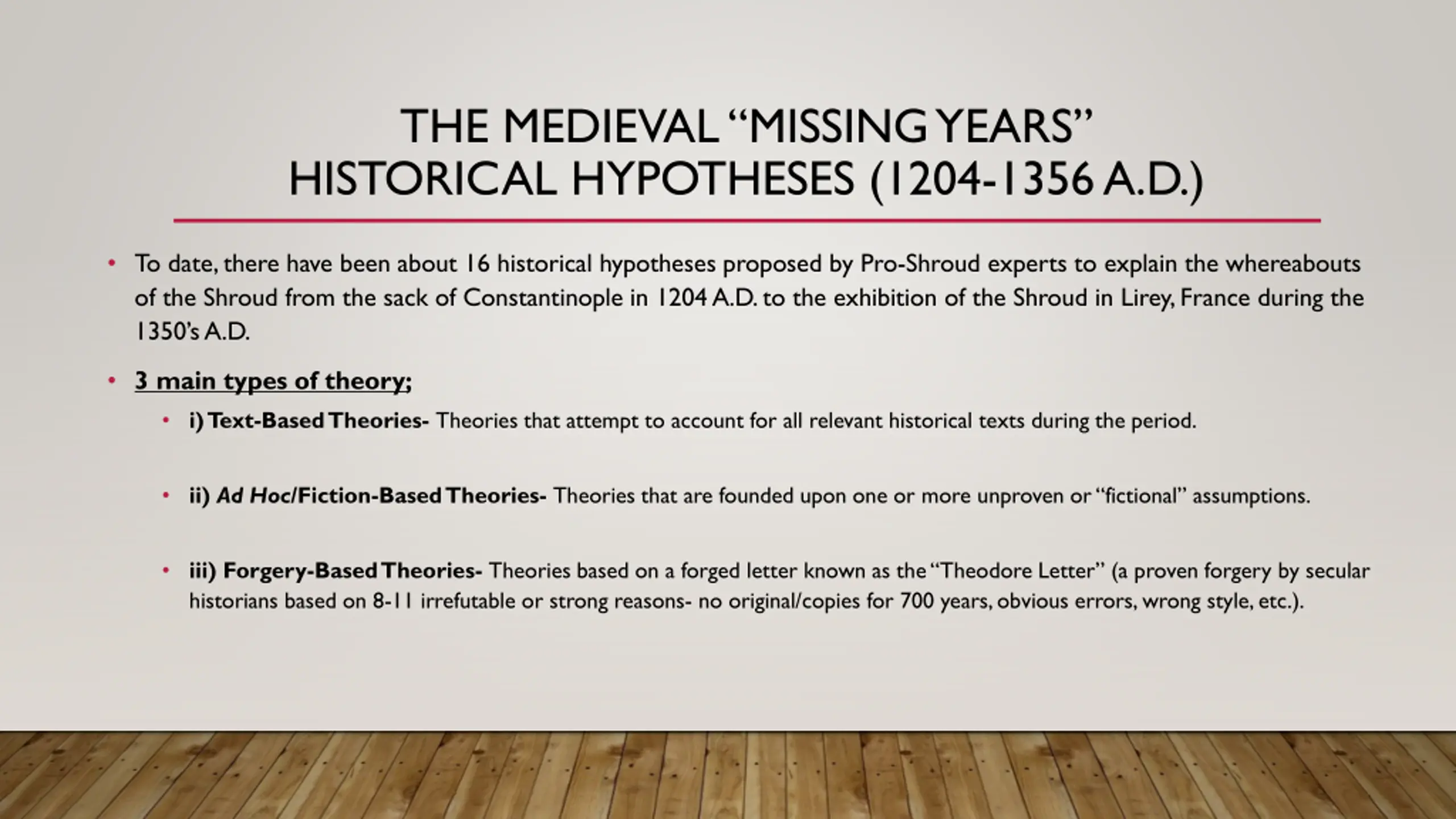 THE MEDIEVAL MISSING YEARS HISTORICAL HYPOTHESES (1204-1356 A.D.) To date, there have been about 16 historical hypotheses proposed by Pro-Shroud experts to explain the whereabouts of the Shroud from the sack of Constantinople in 1204 A.D. to the exhibition of the Shroud in Lirey, France during the 1350 s A.D. 3 main types of theory; i) Text-Based Theories- Theories that attempt to account for all relevant historical texts during the period. ii) Ad Hoc/Fiction-Based Theories- Theories that are founded upon one or more unproven or fictional assumptions. iii) Forgery-Based Theories- Theories based on a forged letter known as the Theodore Letter (a proven forgery by secular historians based on 8-11 irrefutable or strong reasons- no original/copies for 700 years, obvious errors, wrong style, etc.).