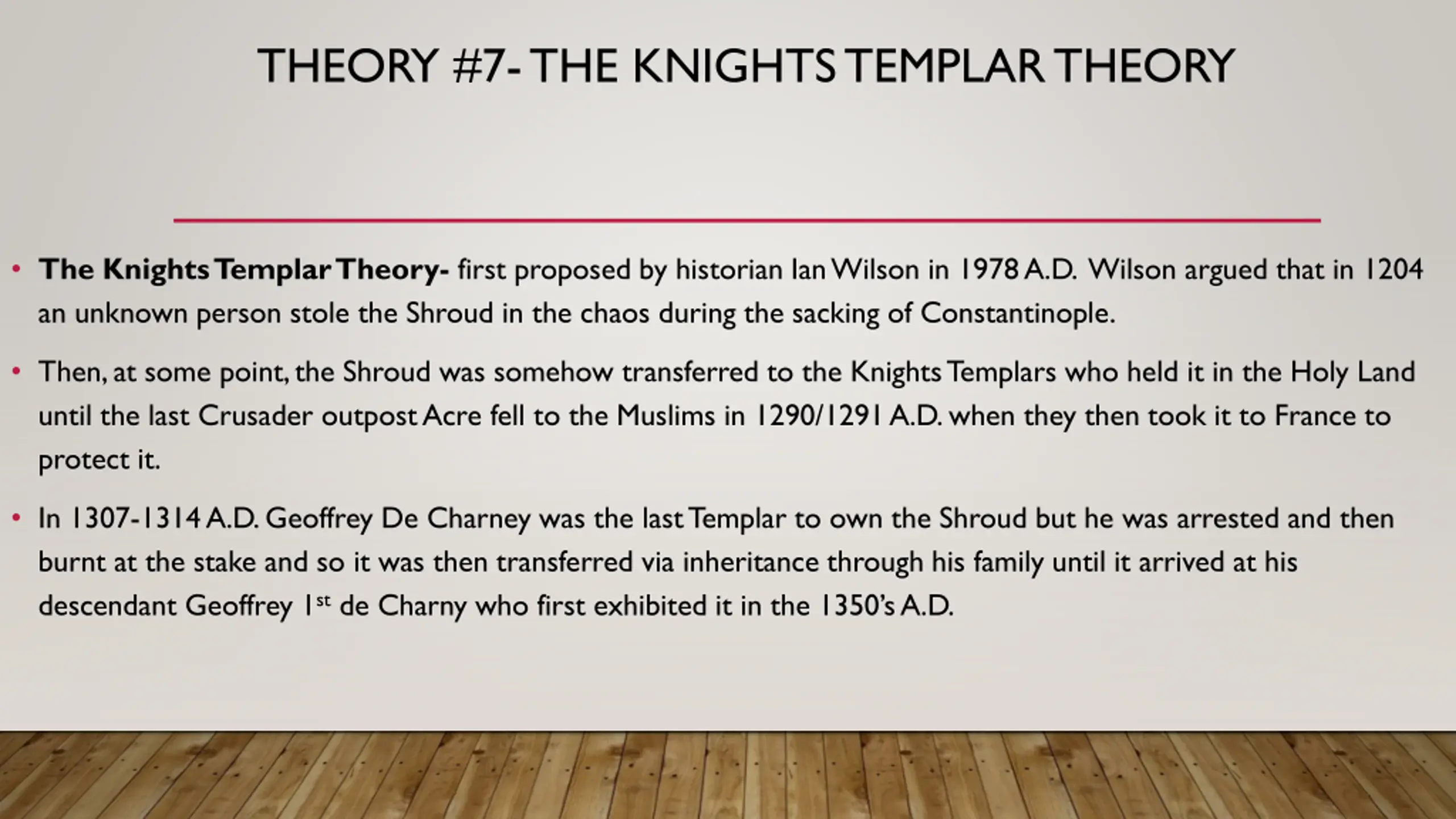 THEORY #7-THE KNIGHTS TEMPLAR THEORY The Knights Templar Theory- first proposed by historian Ian Wilson in 1978 A.D. Wilson argued that in 1204 an unknown person stole the Shroud in the chaos during the sacking of Constantinople. Then, at some point, the Shroud was somehow transferred to the Knights Templars who held it in the Holy Land until the last Crusader outpost Acre fell to the Muslims in 1290/1291 A.D. when they then took it to France to protect it. In 1307-1314 A.D. Geoffrey De Charney was the last Templar to own the Shroud but he was arrested and then burnt at the stake and so it was then transferred via inheritance through his family until it arrived at his descendant Geoffrey 1stde Charny who first exhibited it in the 1350 s A.D.