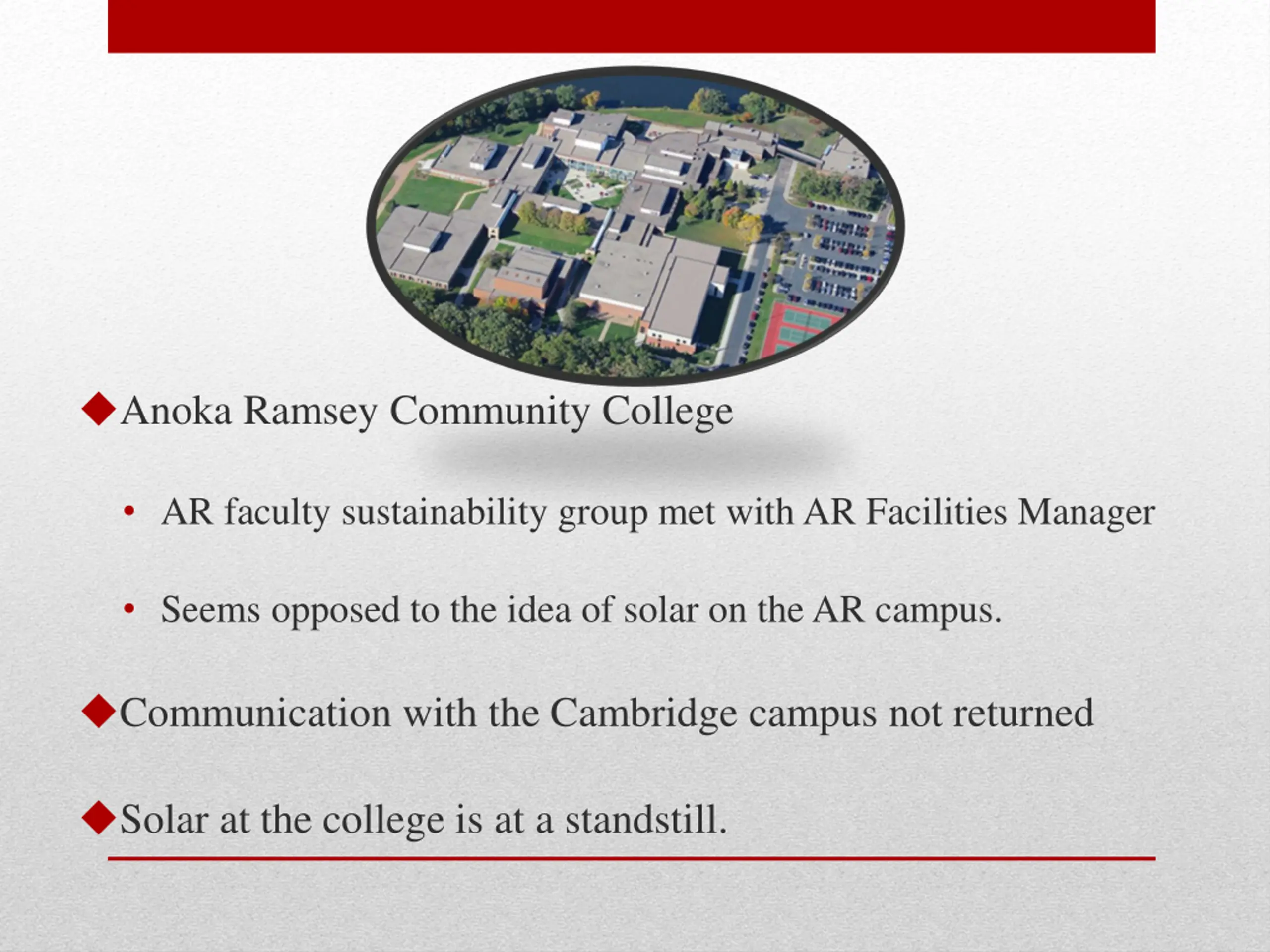 Anoka Ramsey Community College AR faculty sustainability group met with AR Facilities Manager Seems opposed to the idea of solar on the AR campus. Communication with the Cambridge campus not returned Solar at the college is at a standstill.