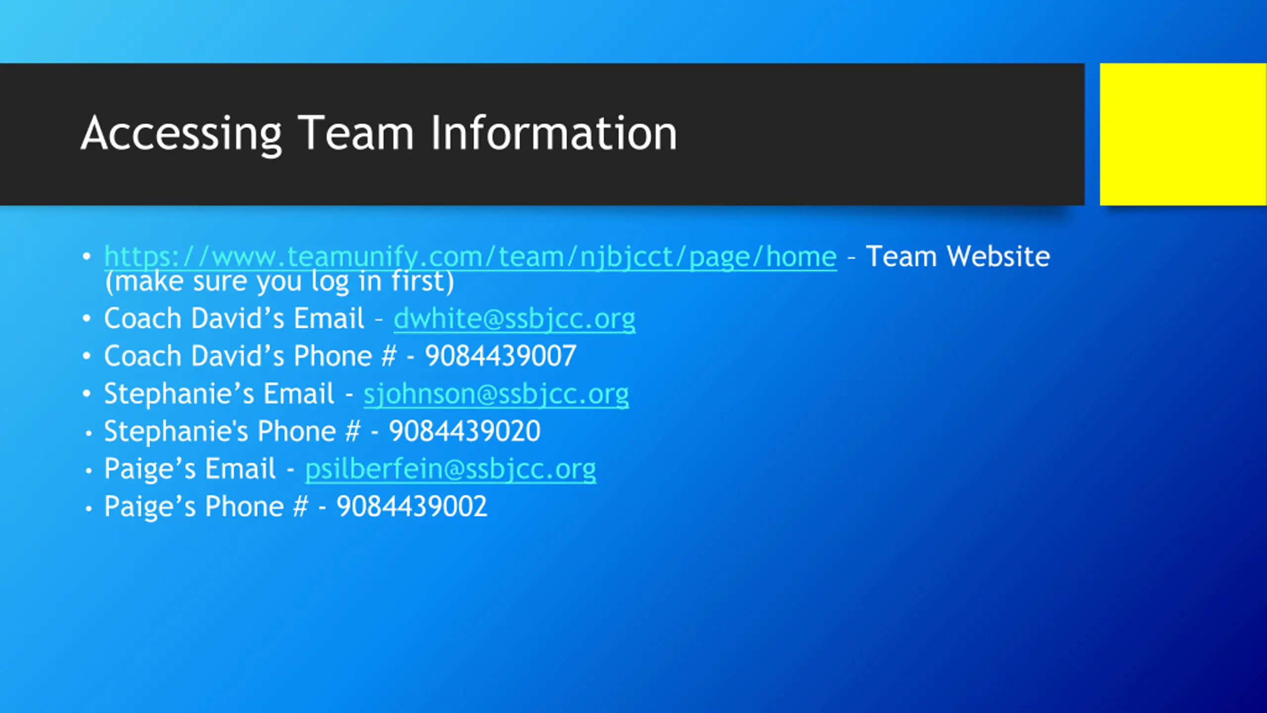 Accessing Team Information https://www.teamunify.com/team/njbjcct/page/home Team Website (make sure you log in first) Coach David s Email dwhite@ssbjcc.org Coach David s Phone # - 9084439007 Stephanie s Email - sjohnson@ssbjcc.org Stephanie's Phone # - 9084439020 Paige s Email - psilberfein@ssbjcc.org Paige s Phone # - 9084439002