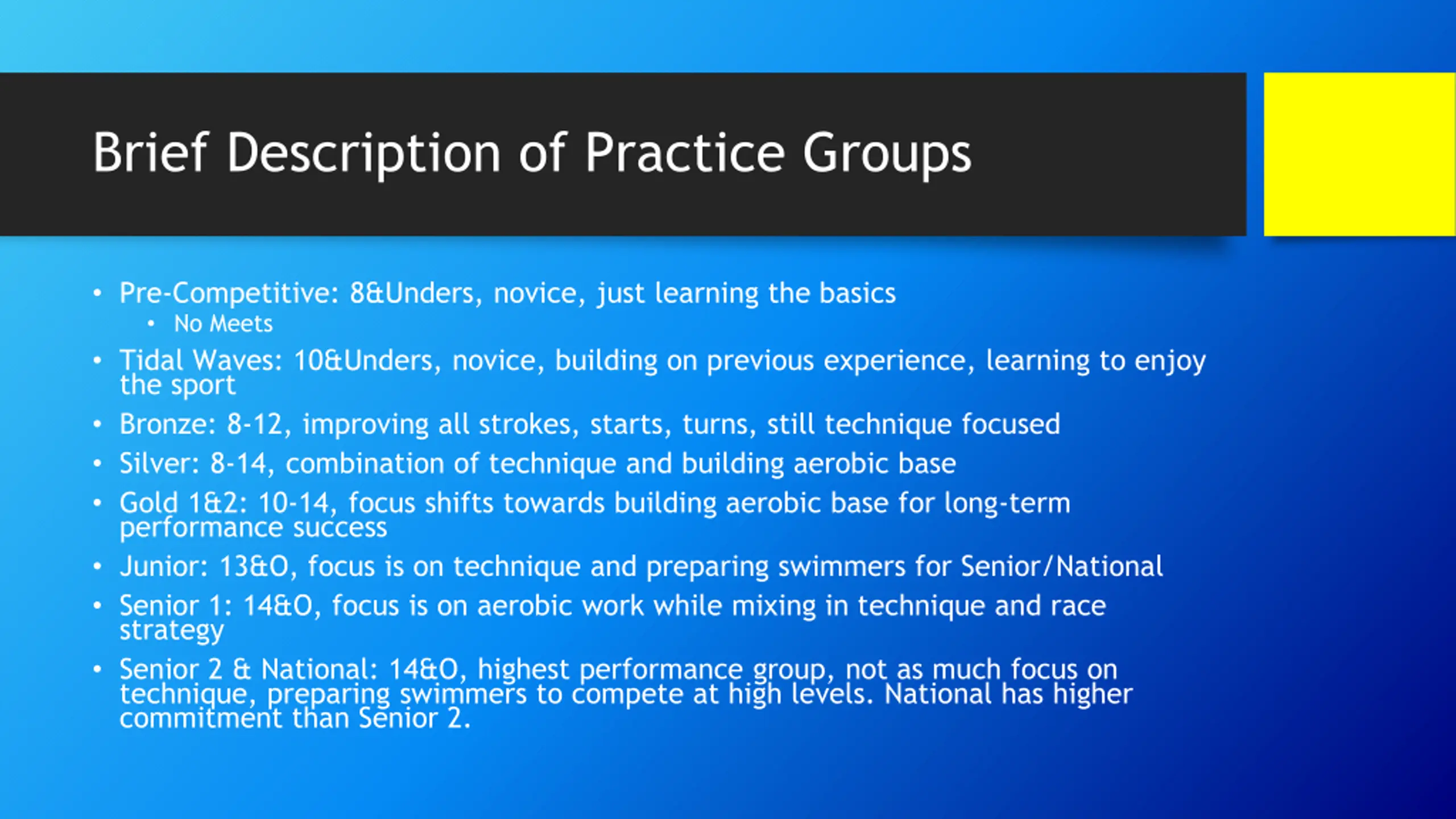 Brief Description of Practice Groups Pre-Competitive: 8&Unders, novice, just learning the basics No Meets Tidal Waves: 10&Unders, novice, building on previous experience, learning to enjoy the sport Bronze: 8-12, improving all strokes, starts, turns, still technique focused Silver: 8-14, combination of technique and building aerobic base Gold 1&2: 10-14, focus shifts towards building aerobic base for long-term performance success Junior: 13&O, focus is on technique and preparing swimmers for Senior/National Senior 1: 14&O, focus is on aerobic work while mixing in technique and race strategy Senior 2 & National: 14&O, highest performance group, not as much focus on technique, preparing swimmers to compete at high levels. National has higher commitment than Senior 2.
