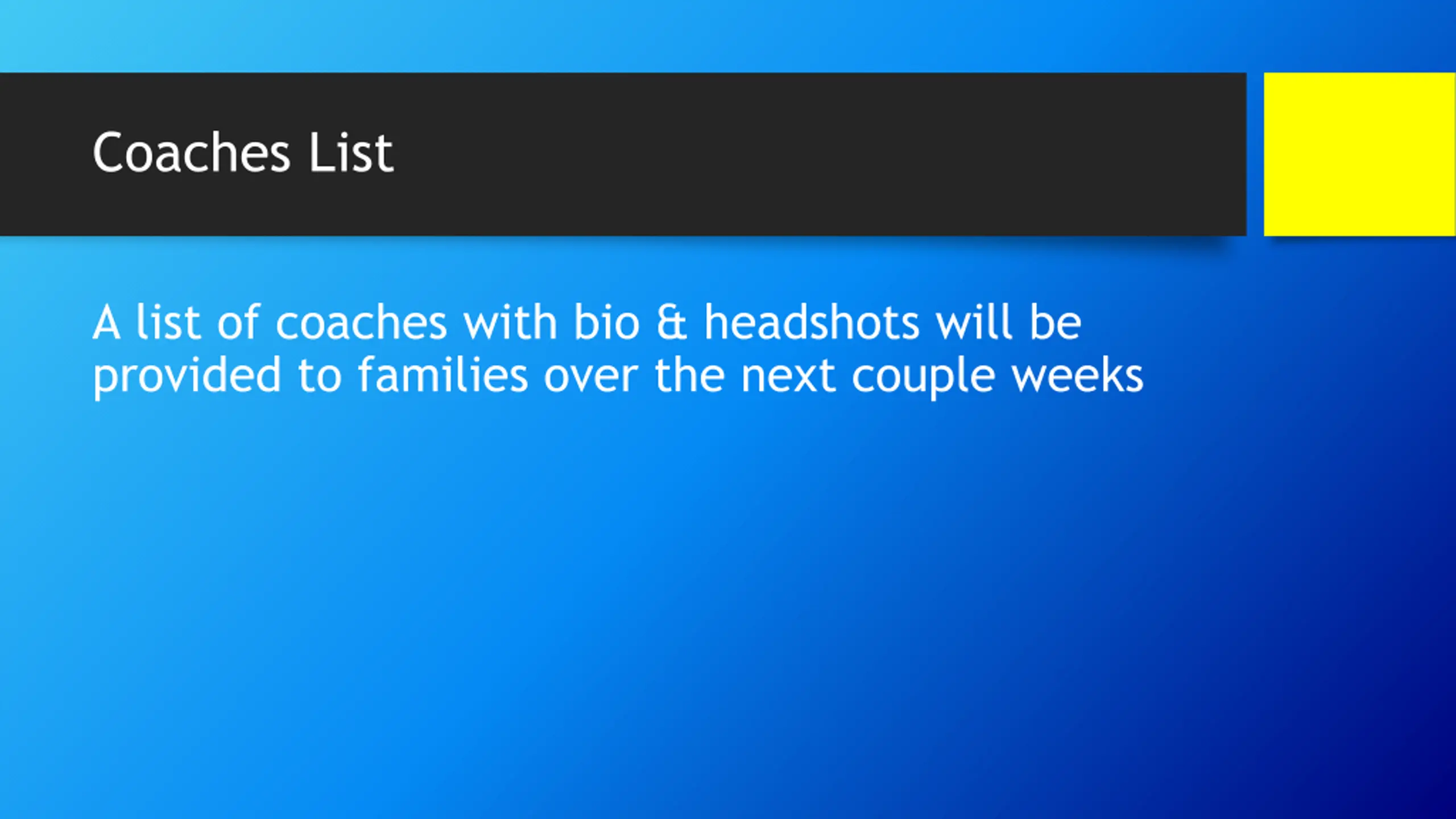 Coaches List A list of coaches with bio & headshots will be provided to families over the next couple weeks