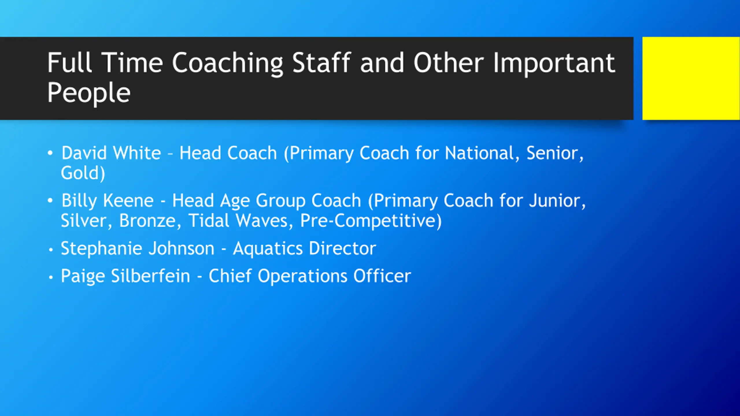 Full Time Coaching Staff and Other Important People David White Head Coach (Primary Coach for National, Senior, Gold) Billy Keene - Head Age Group Coach (Primary Coach for Junior, Silver, Bronze, Tidal Waves, Pre-Competitive) Stephanie Johnson - Aquatics Director Paige Silberfein - Chief Operations Officer