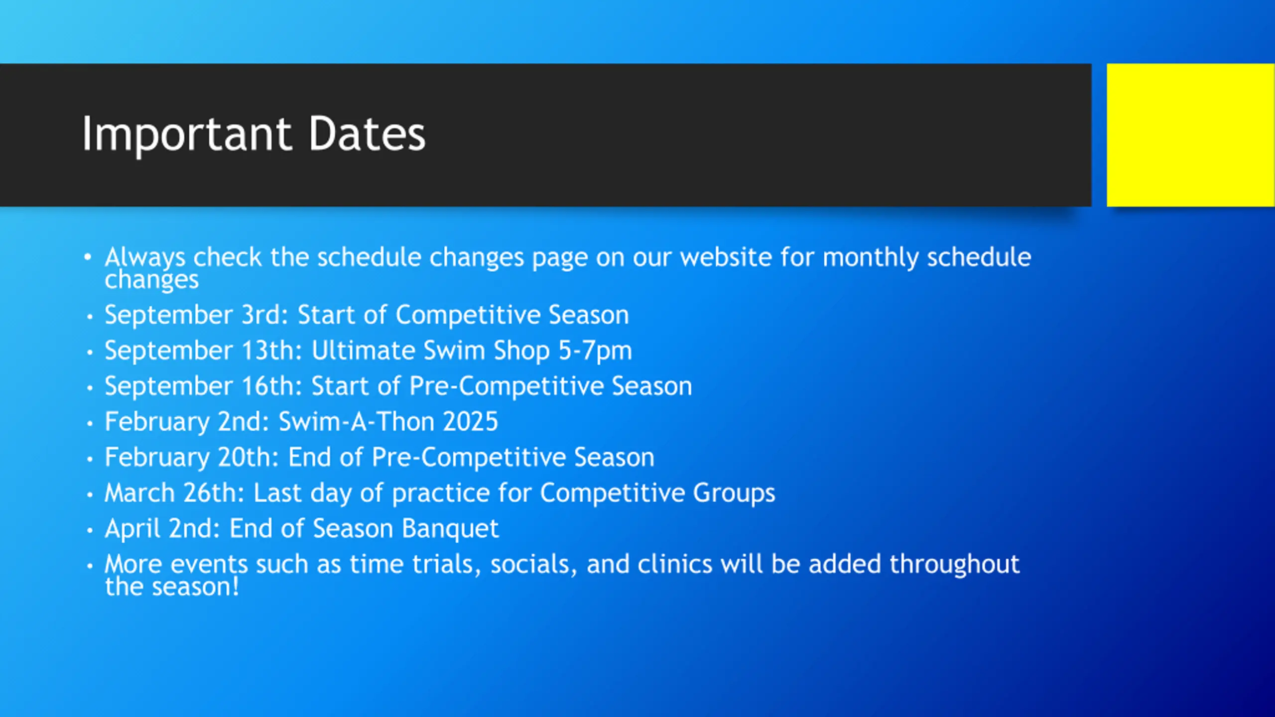 Important Dates Always check the schedule changes page on our website for monthly schedule changes September 3rd: Start of Competitive Season September 13th: Ultimate Swim Shop 5-7pm September 16th: Start of Pre-Competitive Season February 2nd: Swim-A-Thon 2025 February 20th: End of Pre-Competitive Season March 26th: Last day of practice for Competitive Groups April 2nd: End of Season Banquet More events such as time trials, socials, and clinics will be added throughout the season!