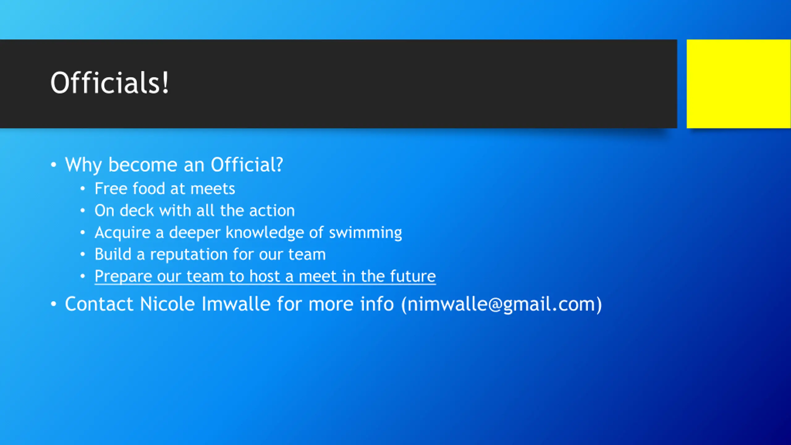 Officials! Why become an Official? Free food at meets On deck with all the action Acquire a deeper knowledge of swimming Build a reputation for our team Prepare our team to host a meet in the future Contact Nicole Imwalle for more info (nimwalle@gmail.com)