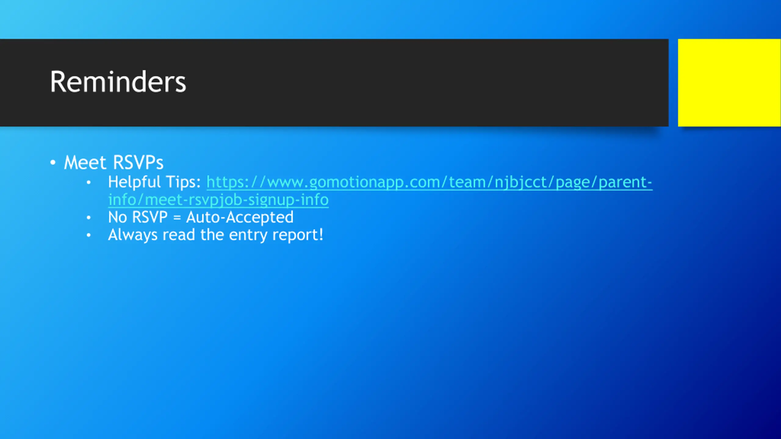 Reminders Meet RSVPs Helpful Tips: https://www.gomotionapp.com/team/njbjcct/page/parent- info/meet-rsvpjob-signup-info No RSVP = Auto-Accepted Always read the entry report!