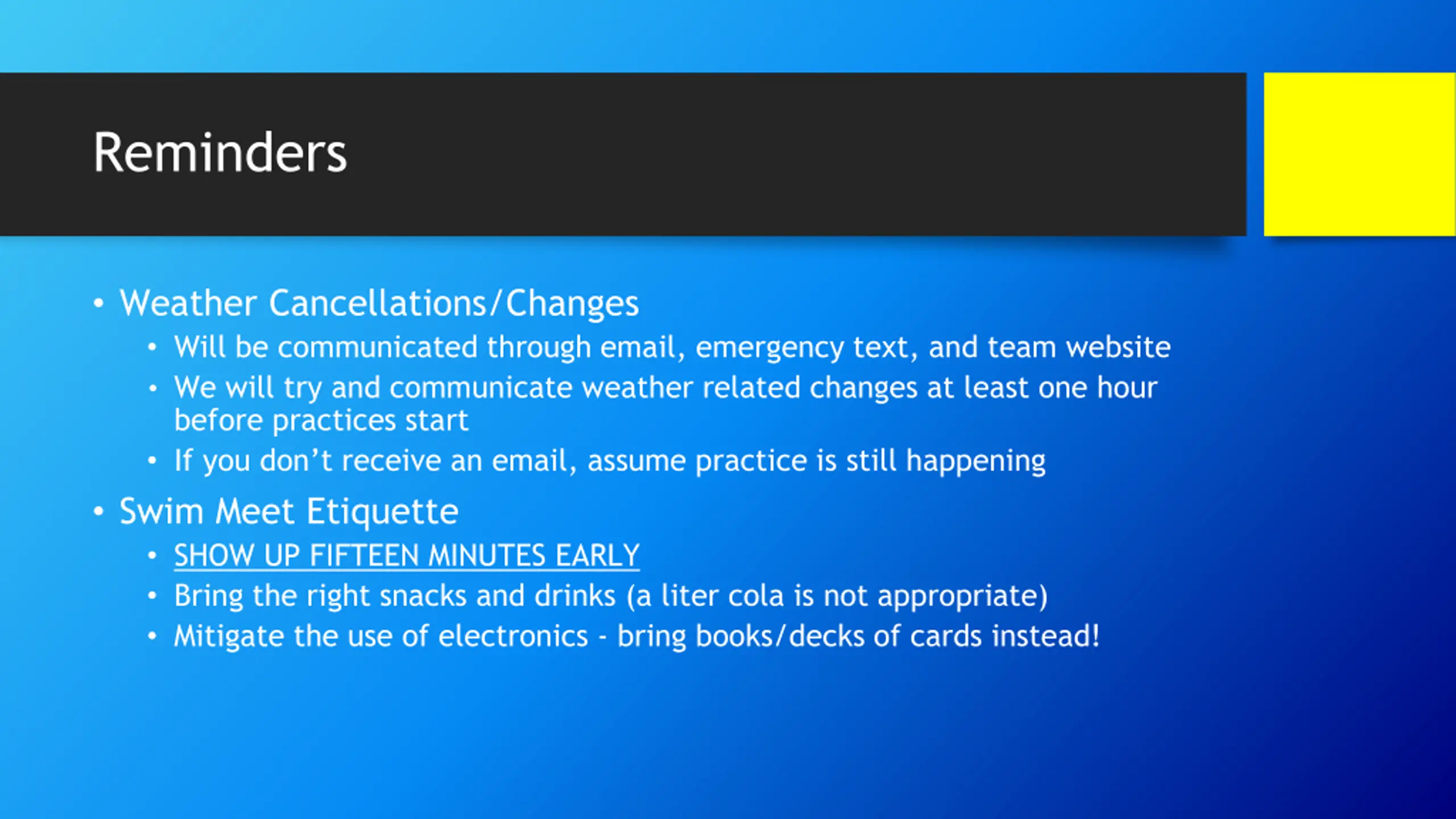 Reminders Weather Cancellations/Changes Will be communicated through email, emergency text, and team website We will try and communicate weather related changes at least one hour before practices start If you don t receive an email, assume practice is still happening Swim Meet Etiquette SHOW UP FIFTEEN MINUTES EARLY Bring the right snacks and drinks (a liter cola is not appropriate) Mitigate the use of electronics - bring books/decks of cards instead!