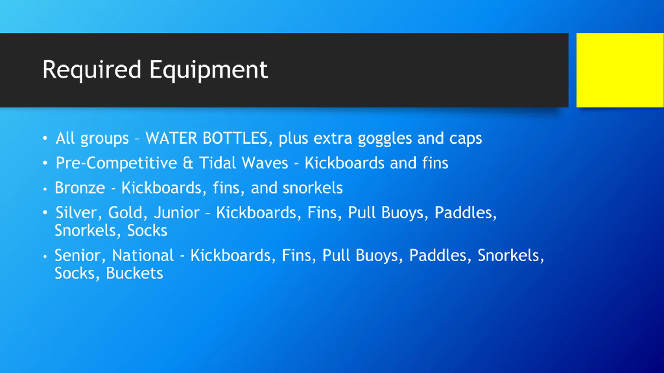 Required Equipment All groups WATER BOTTLES, plus extra goggles and caps Pre-Competitive & Tidal Waves - Kickboards and fins Bronze - Kickboards, fins, and snorkels Silver, Gold, Junior Kickboards, Fins, Pull Buoys, Paddles, Snorkels, Socks Senior, National - Kickboards, Fins, Pull Buoys, Paddles, Snorkels, Socks, Buckets