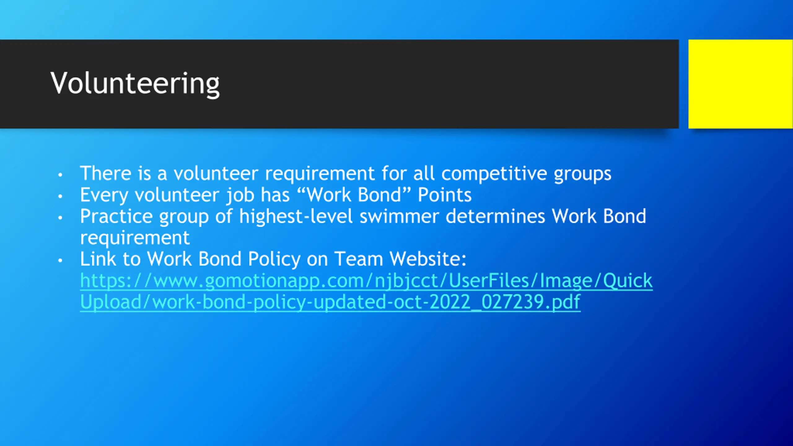 Volunteering There is a volunteer requirement for all competitive groups Every volunteer job has Work Bond Points Practice group of highest-level swimmer determines Work Bond requirement Link to Work Bond Policy on Team Website: https://www.gomotionapp.com/njbjcct/UserFiles/Image/Quick Upload/work-bond-policy-updated-oct-2022_027239.pdf