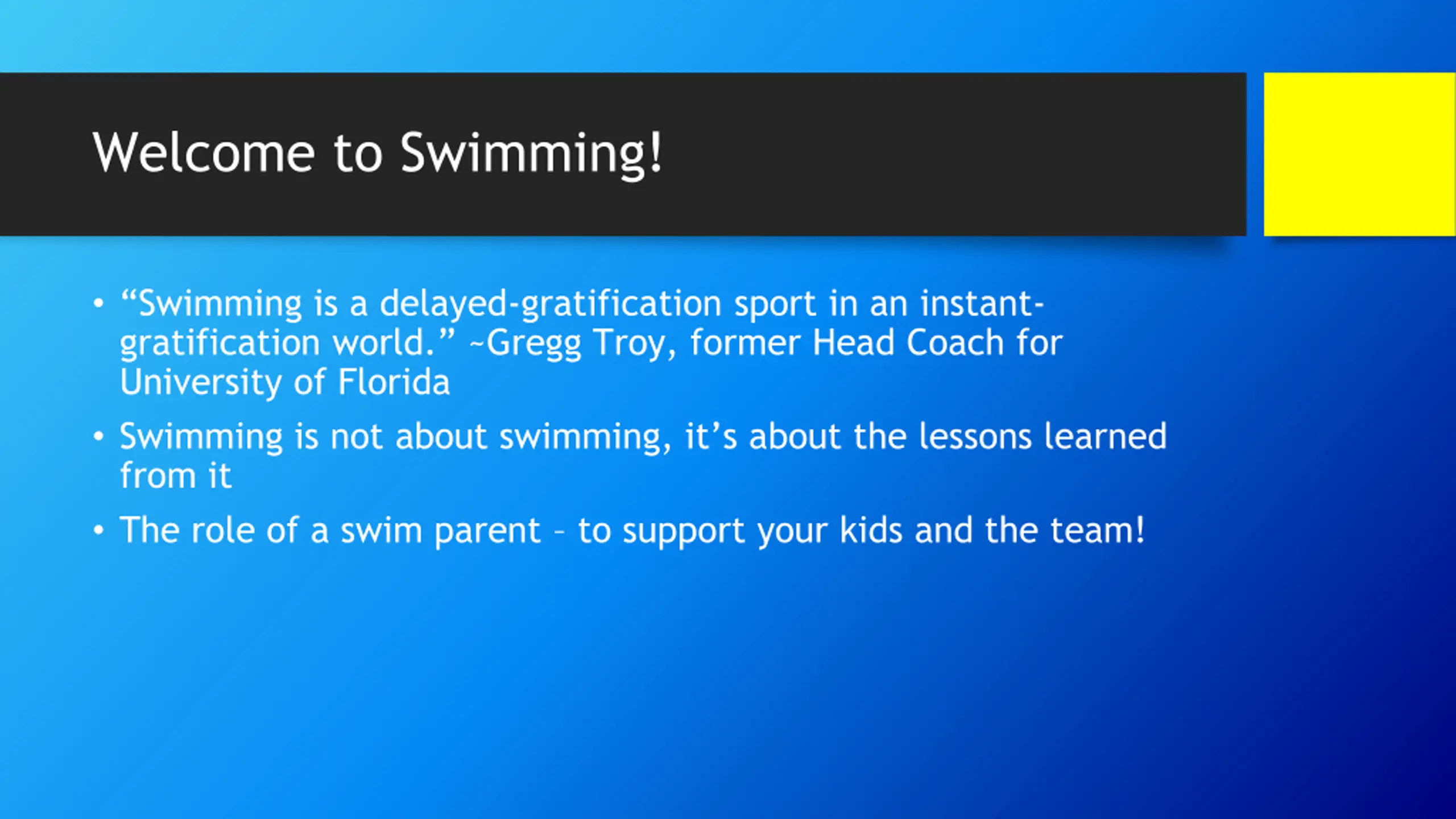 Welcome to Swimming! Swimming is a delayed-gratification sport in an instant- gratification world. ~Gregg Troy, former Head Coach for University of Florida Swimming is not about swimming, it s about the lessons learned from it The role of a swim parent to support your kids and the team!