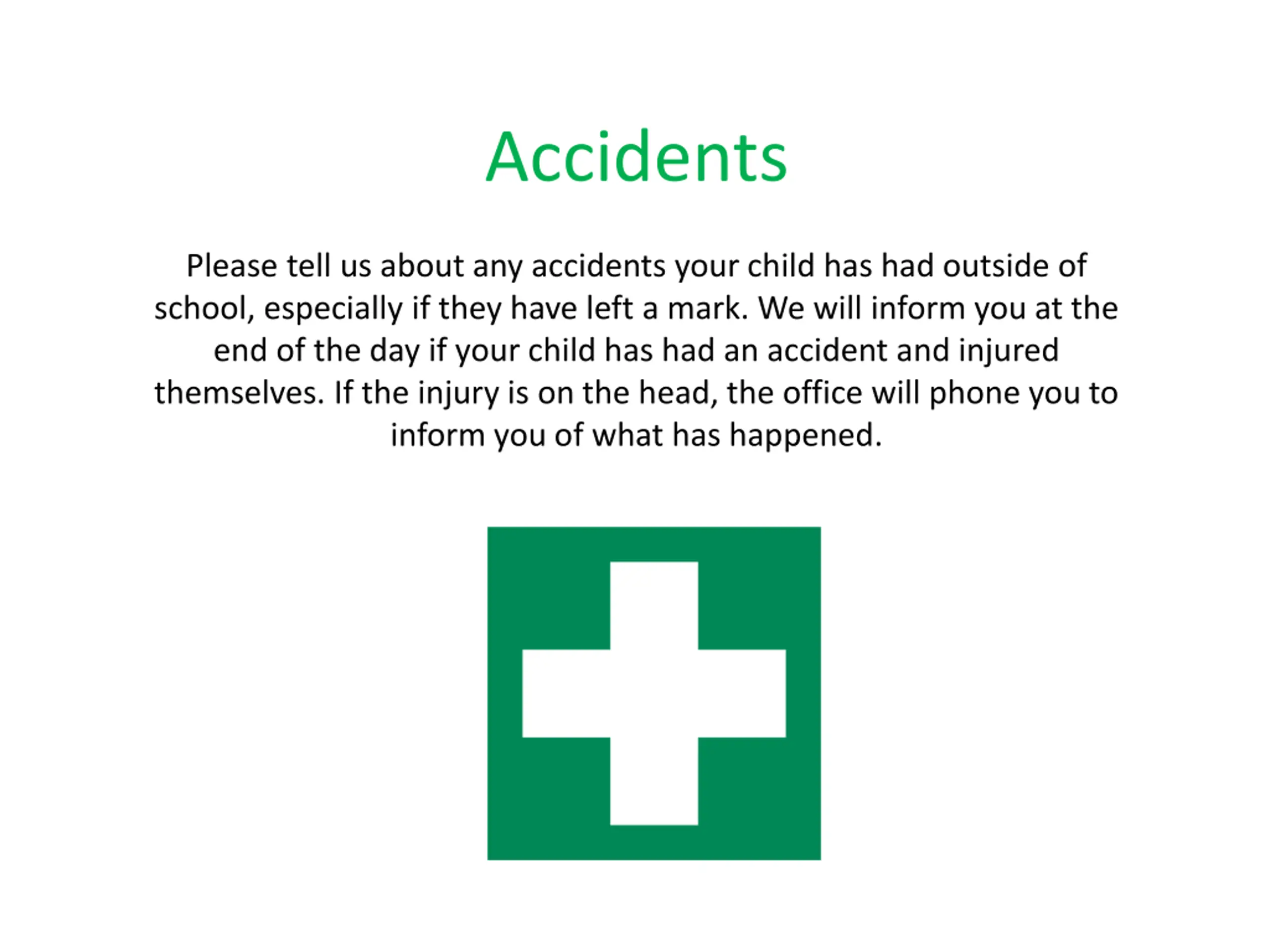 Accidents Please tell us about any accidents your child has had outside of school, especially if they have left a mark. We will inform you at the end of the day if your child has had an accident and injured themselves. If the injury is on the head, the office will phone you to inform you of what has happened. Image result for first aid