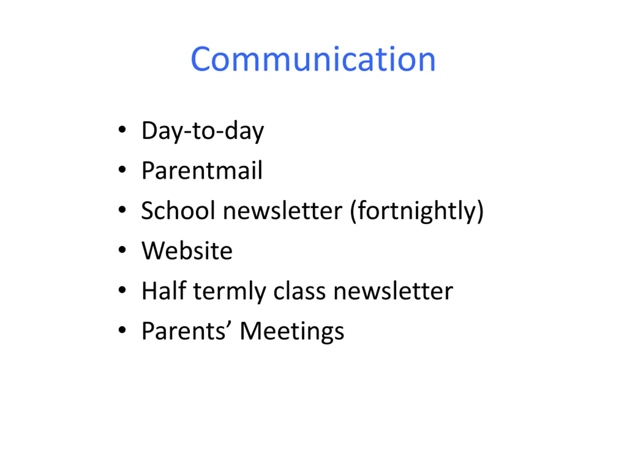 Communication Day-to-day Parentmail School newsletter (fortnightly) Website Half termly class newsletter Parents Meetings