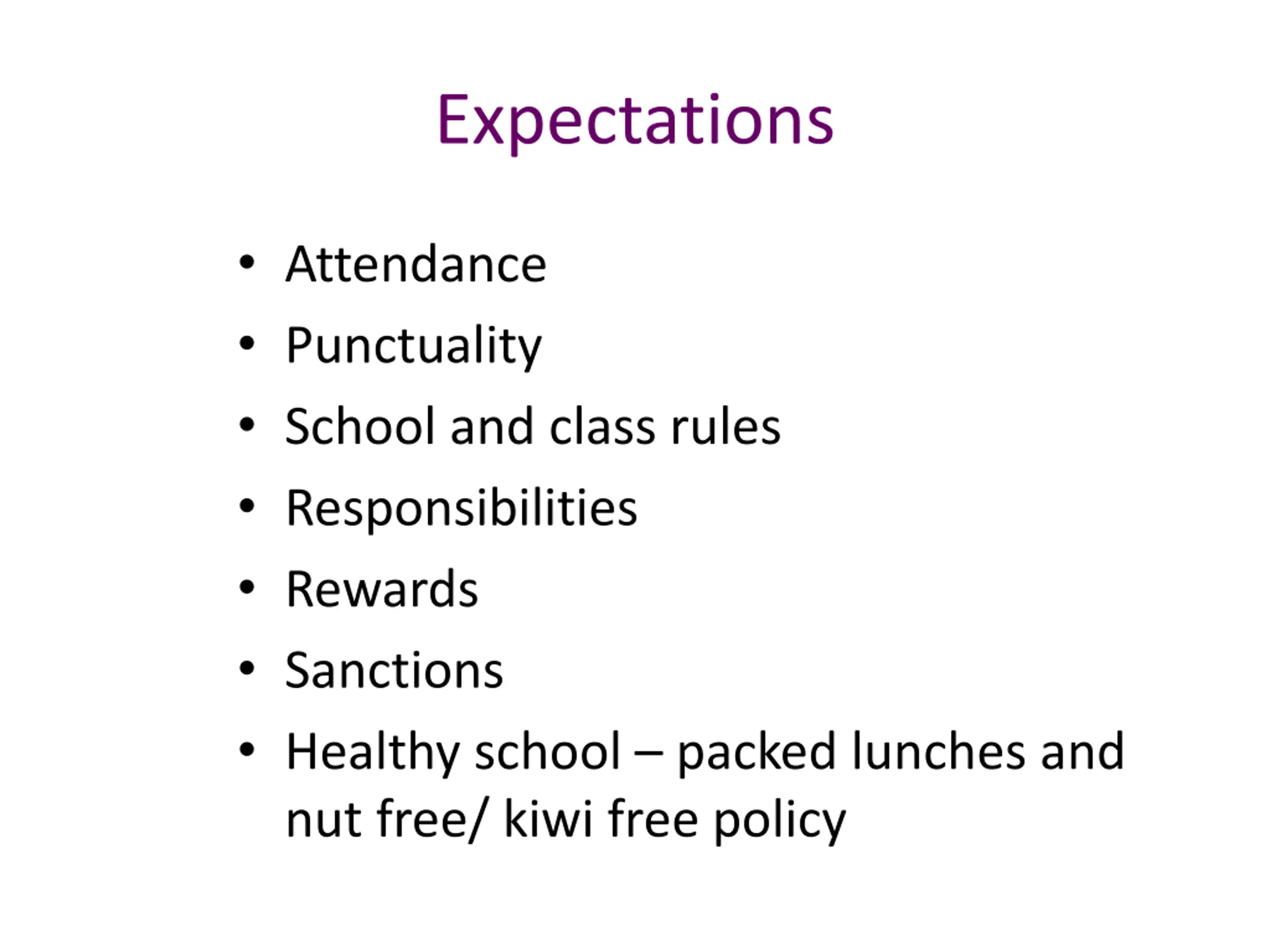 Expectations Attendance Punctuality School and class rules Responsibilities Rewards Sanctions Healthy school packed lunches and nut free/ kiwi free policy