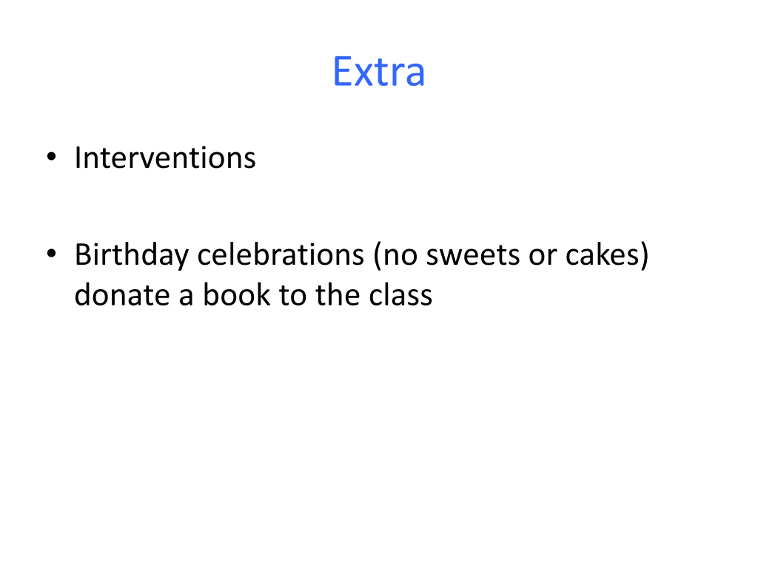 Extra Interventions Birthday celebrations (no sweets or cakes) donate a book to the class
