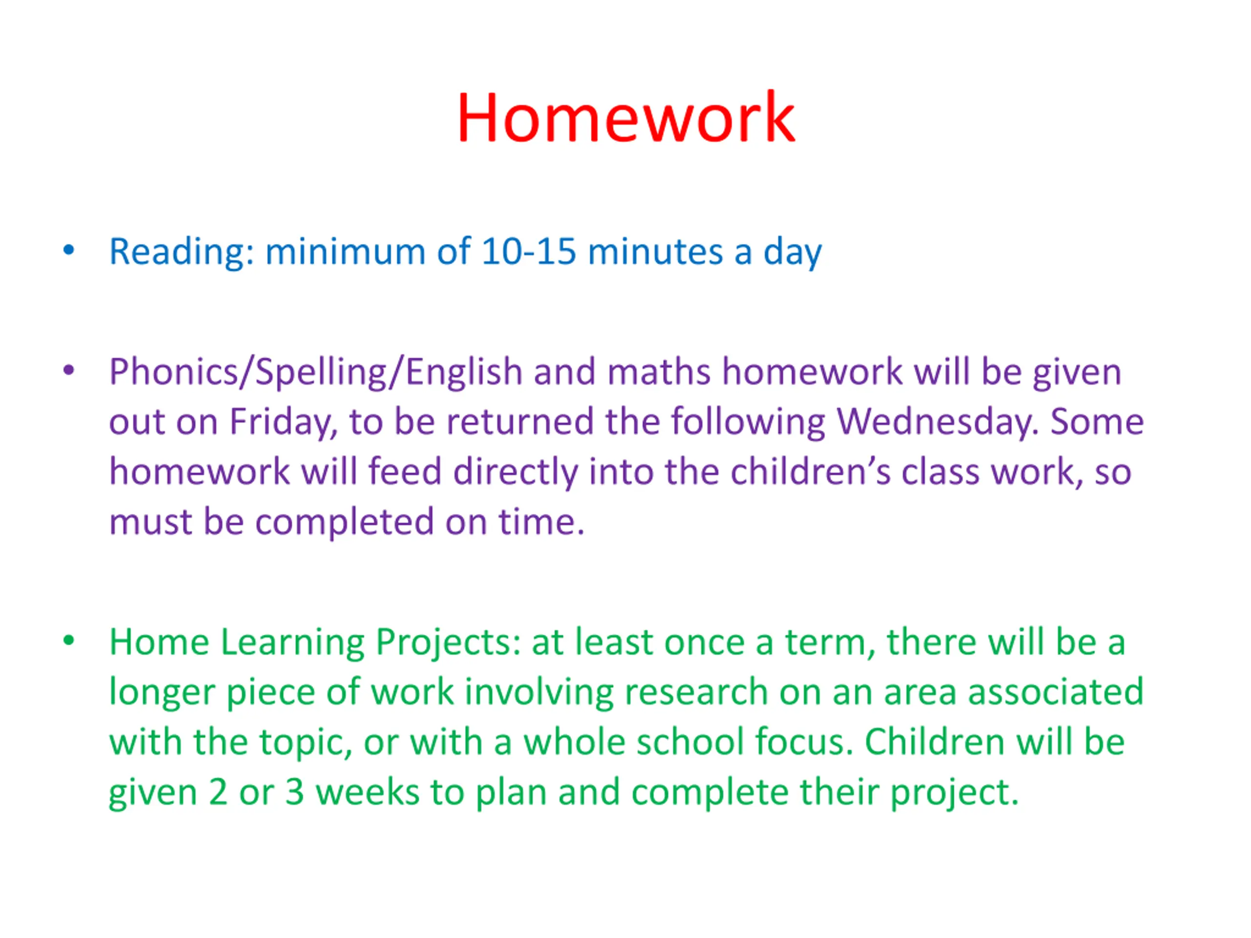 Homework Reading: minimum of 10-15 minutes a day Phonics/Spelling/English and maths homework will be given out on Friday, to be returned the following Wednesday. Some homework will feed directly into the children s class work, so must be completed on time. Home Learning Projects: at least once a term, there will be a longer piece of work involving research on an area associated with the topic, or with a whole school focus. Children will be given 2 or 3 weeks to plan and complete their project.