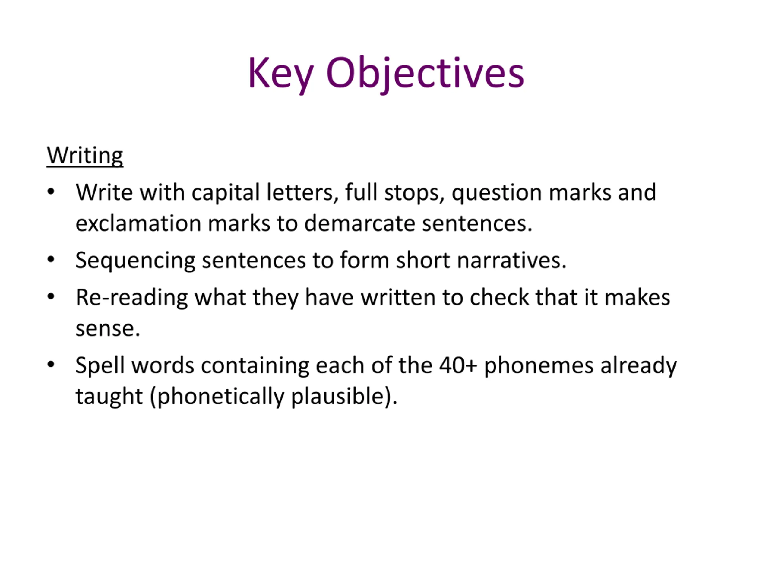 Key Objectives Writing Write with capital letters, full stops, question marks and exclamation marks to demarcate sentences. Sequencing sentences to form short narratives. Re-reading what they have written to check that it makes sense. Spell words containing each of the 40+ phonemes already taught (phonetically plausible).