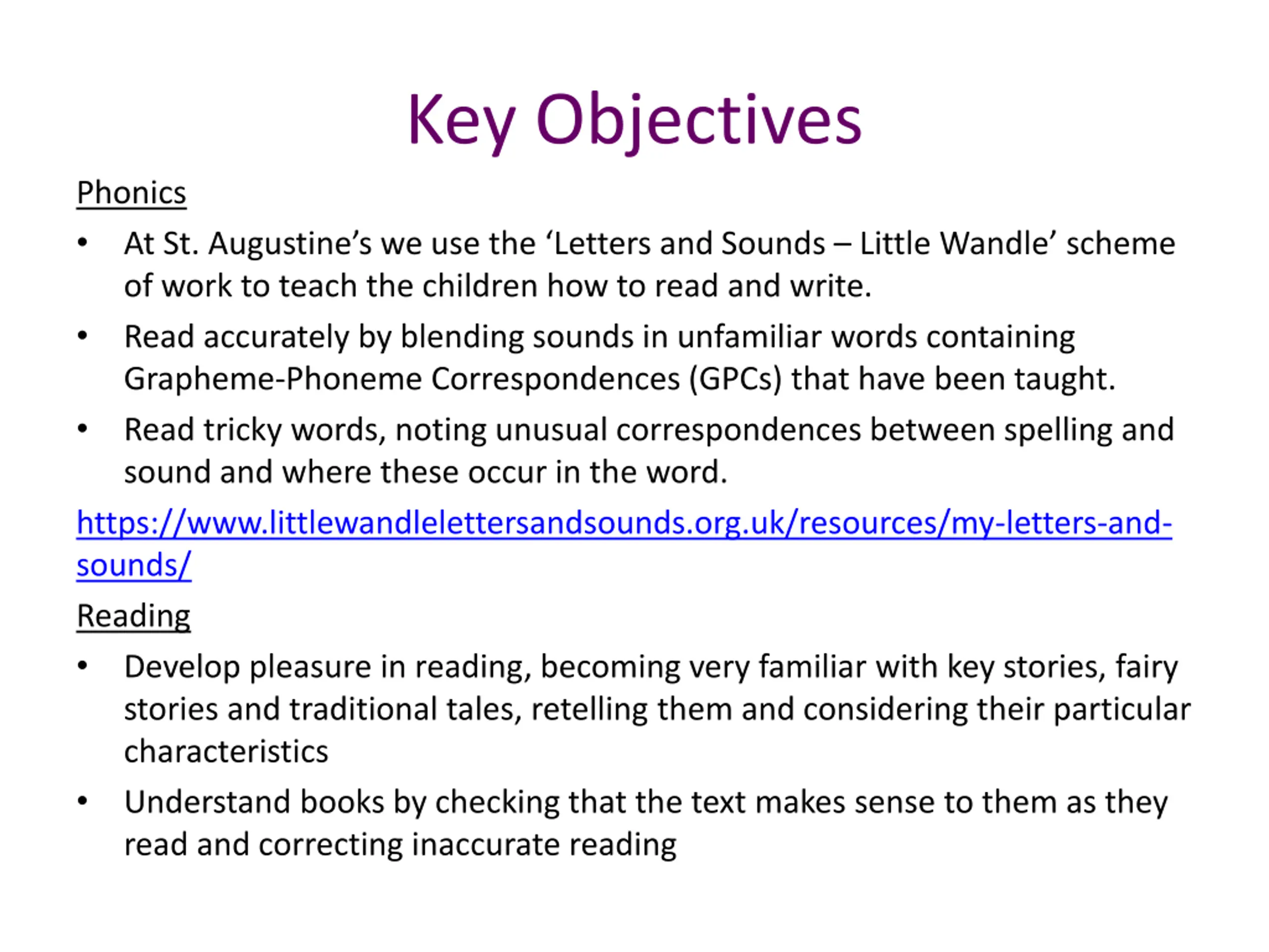 Key Objectives Phonics At St. Augustine s we use the Letters and Sounds Little Wandle scheme of work to teach the children how to read and write. Read accurately by blending sounds in unfamiliar words containing Grapheme-Phoneme Correspondences (GPCs) that have been taught. Read tricky words, noting unusual correspondences between spelling and sound and where these occur in the word. https://www.littlewandlelettersandsounds.org.uk/resources/my-letters-and- sounds/ Reading Develop pleasure in reading, becoming very familiar with key stories, fairy stories and traditional tales, retelling them and considering their particular characteristics Understand books by checking that the text makes sense to them as they read and correcting inaccurate reading