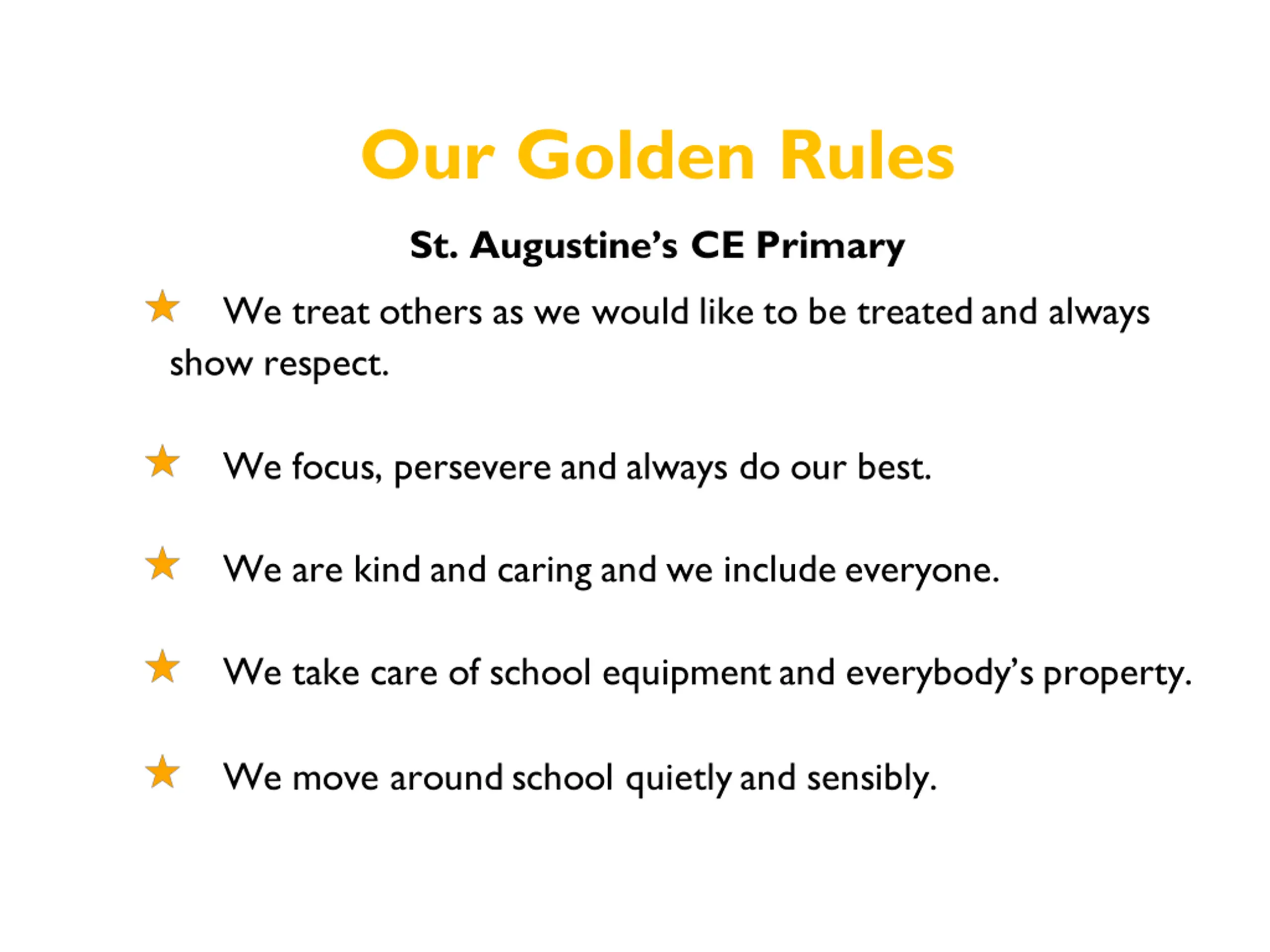 Our Golden Rules St. Augustine s CE Primary We treat others as we would like to be treated and always show respect. We focus, persevere and always do our best. We are kind and caring and we include everyone. We take care of school equipment and everybody s property. We move around school quietly and sensibly.