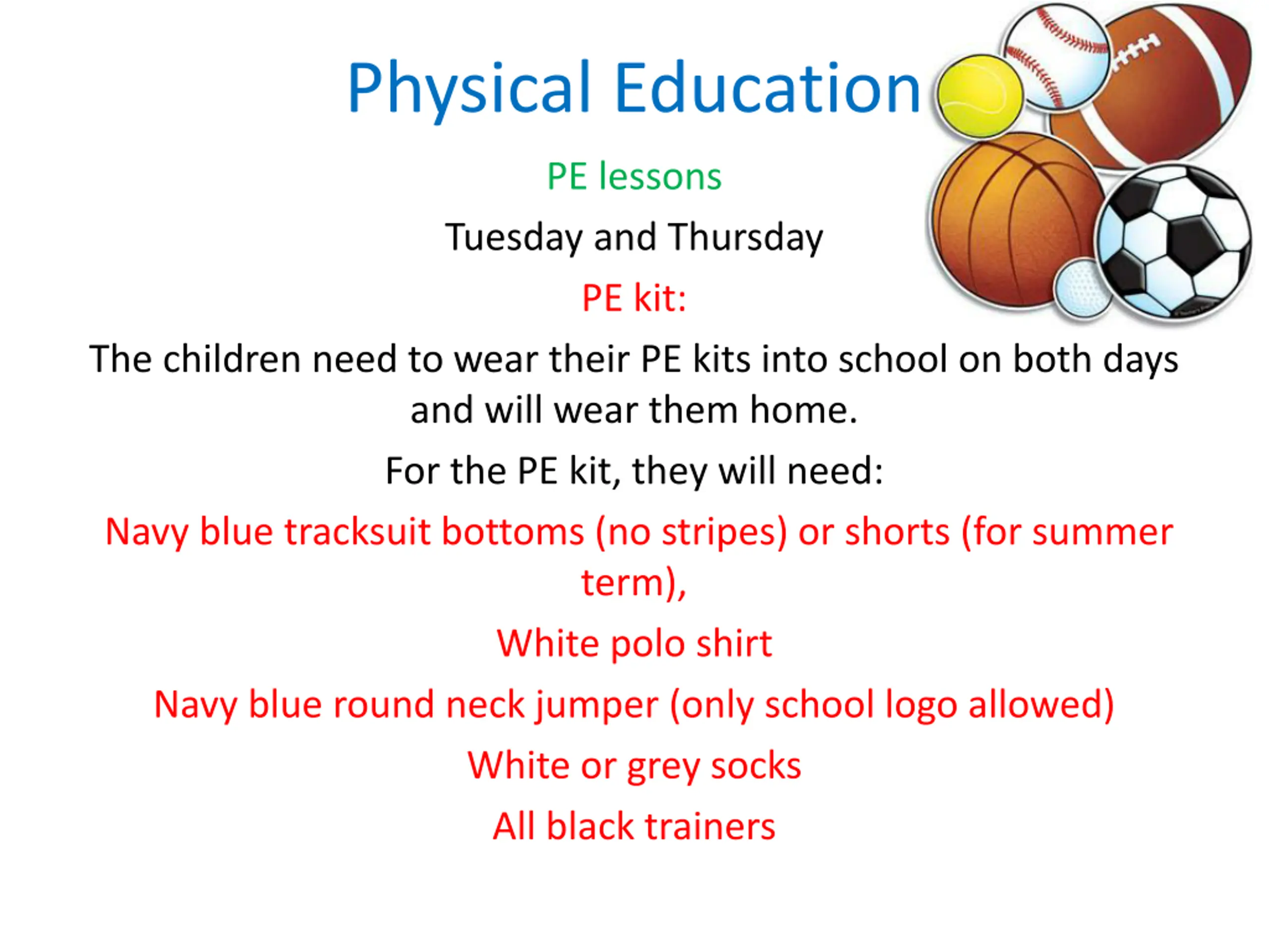 Physical Education PE lessons Tuesday and Thursday PE kit: The children need to wear their PE kits into school on both days and will wear them home. For the PE kit, they will need: Navy blue tracksuit bottoms (no stripes) or shorts (for summer term), White polo shirt Navy blue round neck jumper (only school logo allowed) White or grey socks All black trainers