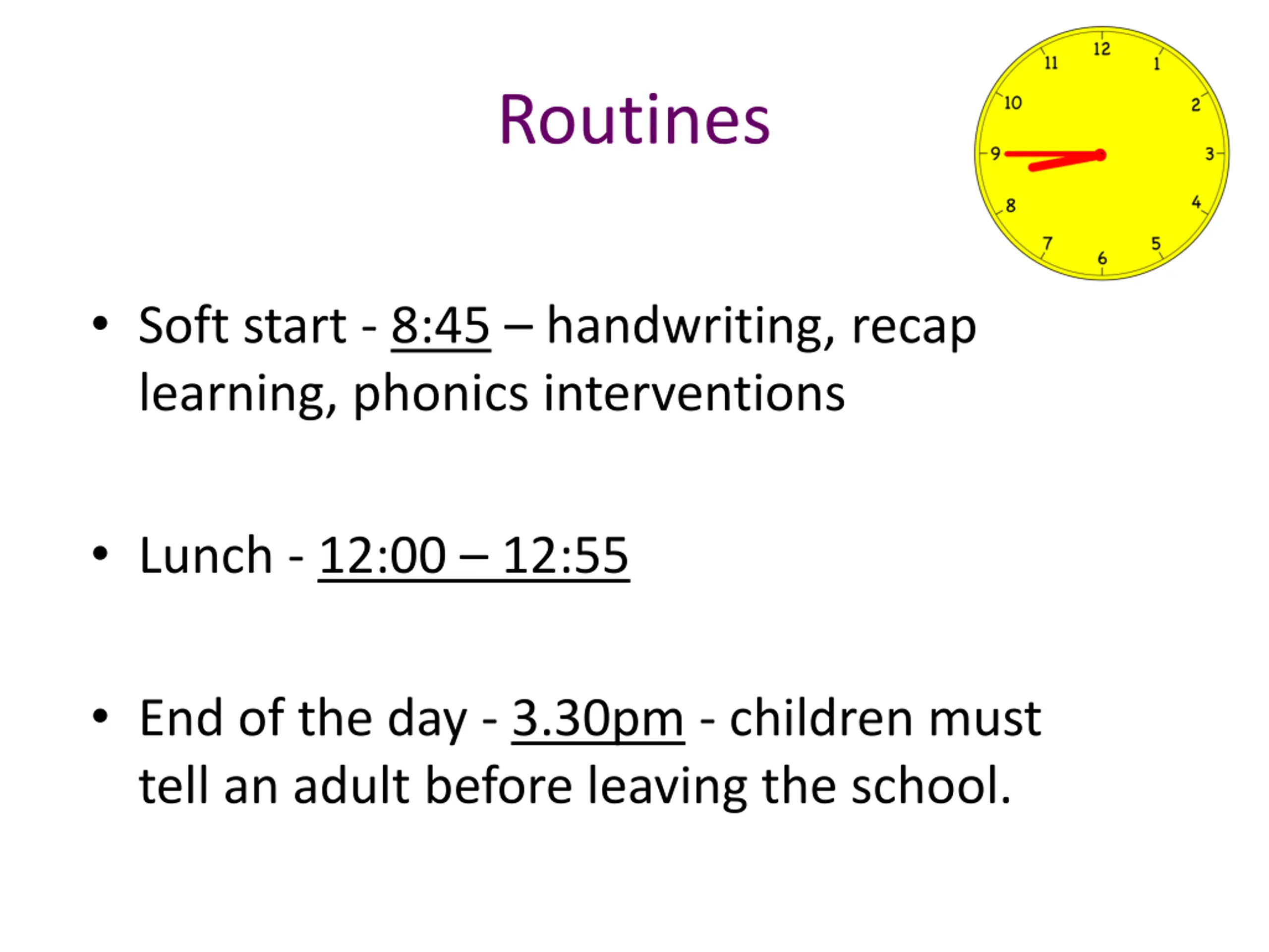 Routines Soft start - 8:45 handwriting, recap learning, phonics interventions Lunch - 12:00 12:55 End of the day - 3.30pm - children must tell an adult before leaving the school.