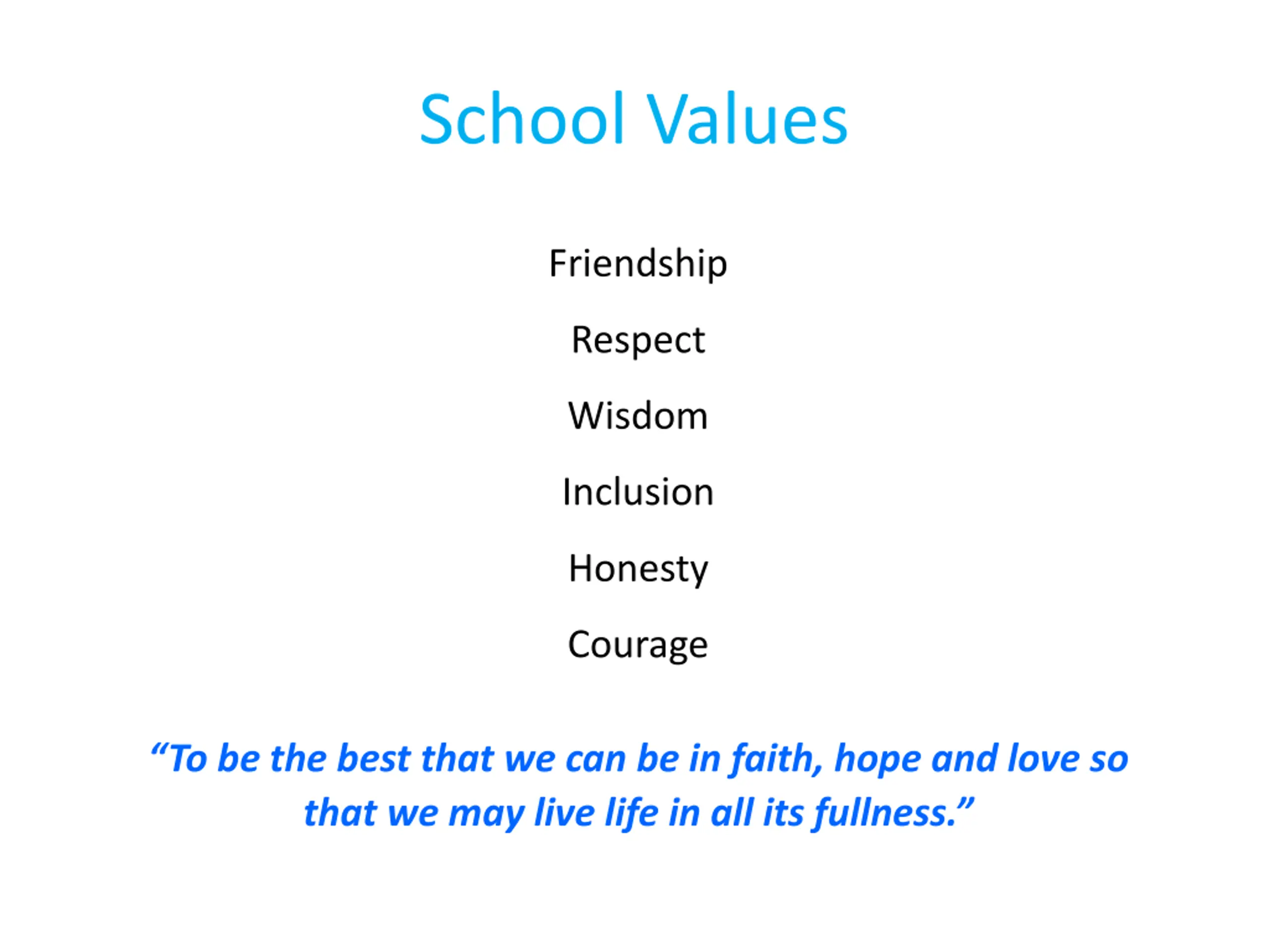 School Values Friendship Respect Wisdom Inclusion Honesty Courage To be the best that we can be in faith, hope and love so that we may live life in all its fullness.
