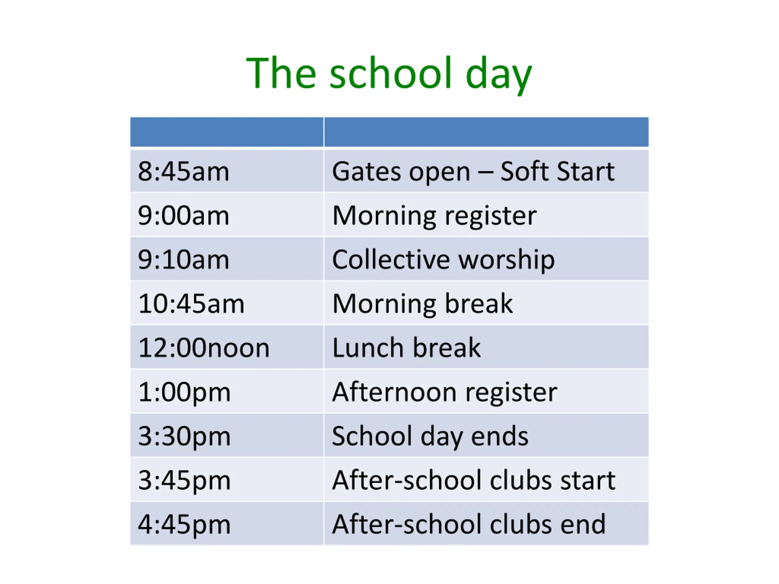 The school day 8:45am 9:00am 9:10am 10:45am 12:00noon 1:00pm 3:30pm 3:45pm 4:45pm Gates open Soft Start Morning register Collective worship Morning break Lunch break Afternoon register School day ends After-school clubs start After-school clubs end