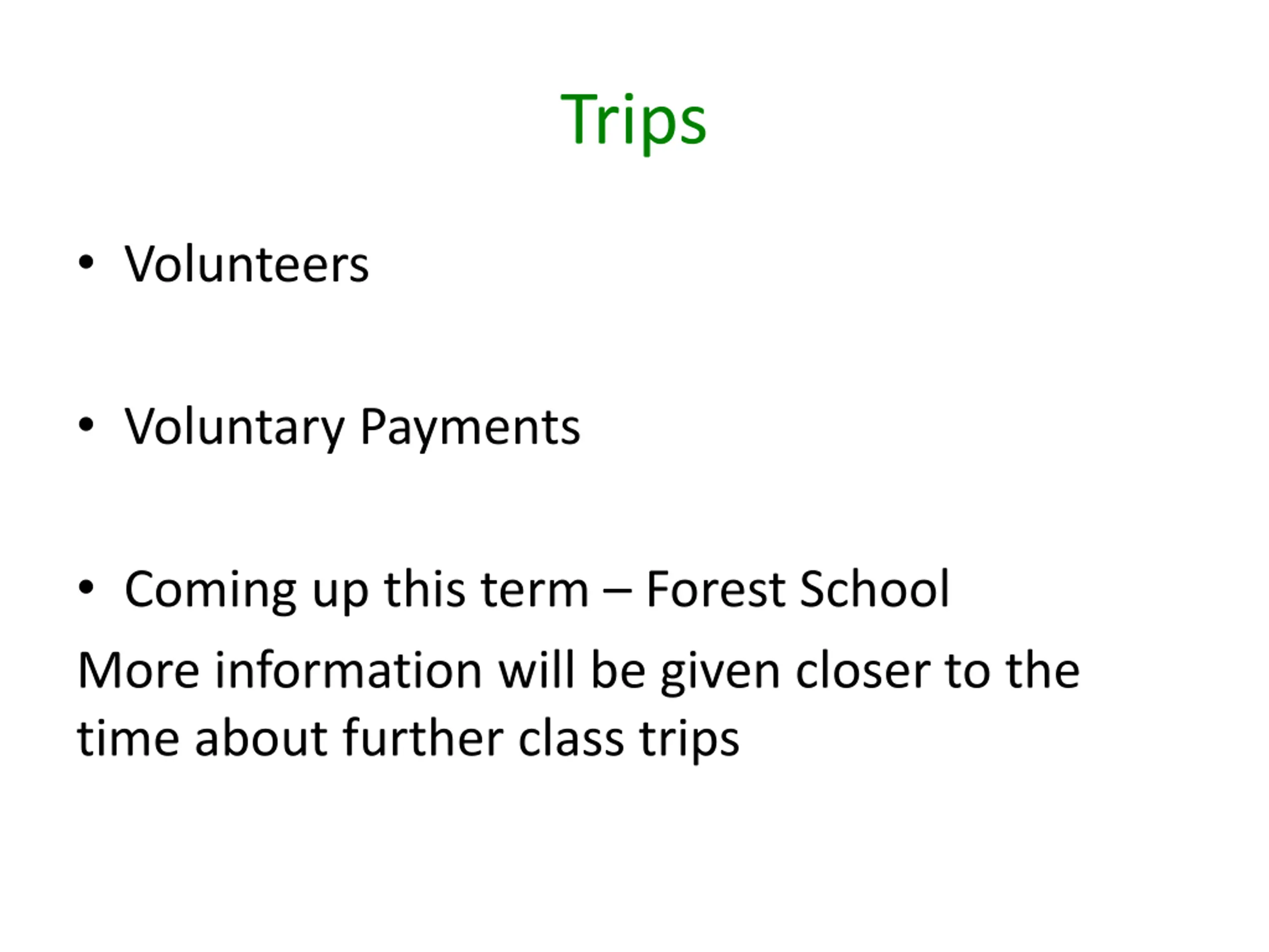 Trips Volunteers Voluntary Payments Coming up this term Forest School More information will be given closer to the time about further class trips