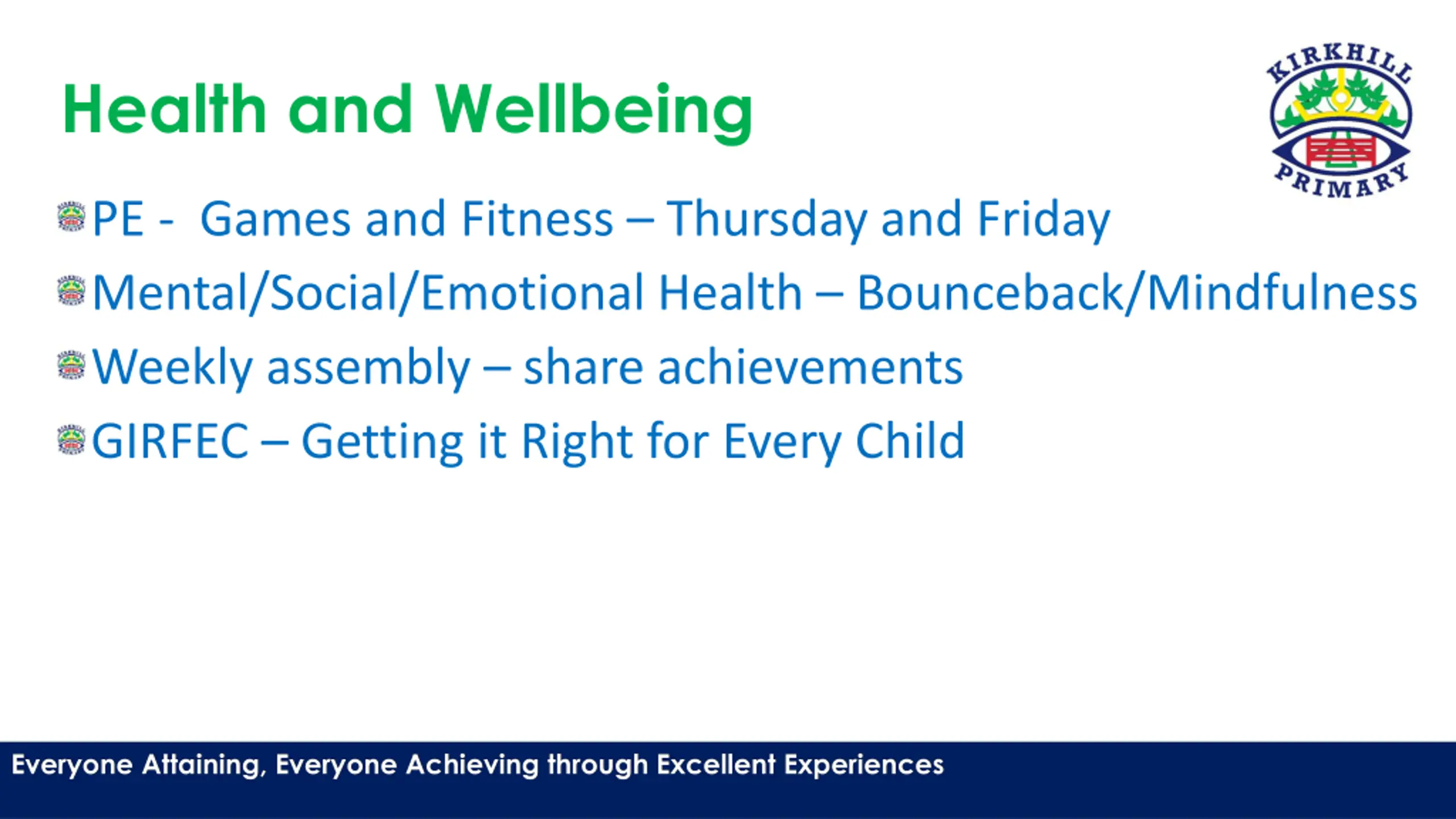 Health and Wellbeing PE - Games and Fitness Thursday and Friday Mental/Social/Emotional Health Bounceback/Mindfulness Weekly assembly share achievements GIRFEC Getting it Right for Every Child Everyone Attaining, Everyone Achieving through Excellent Experiences