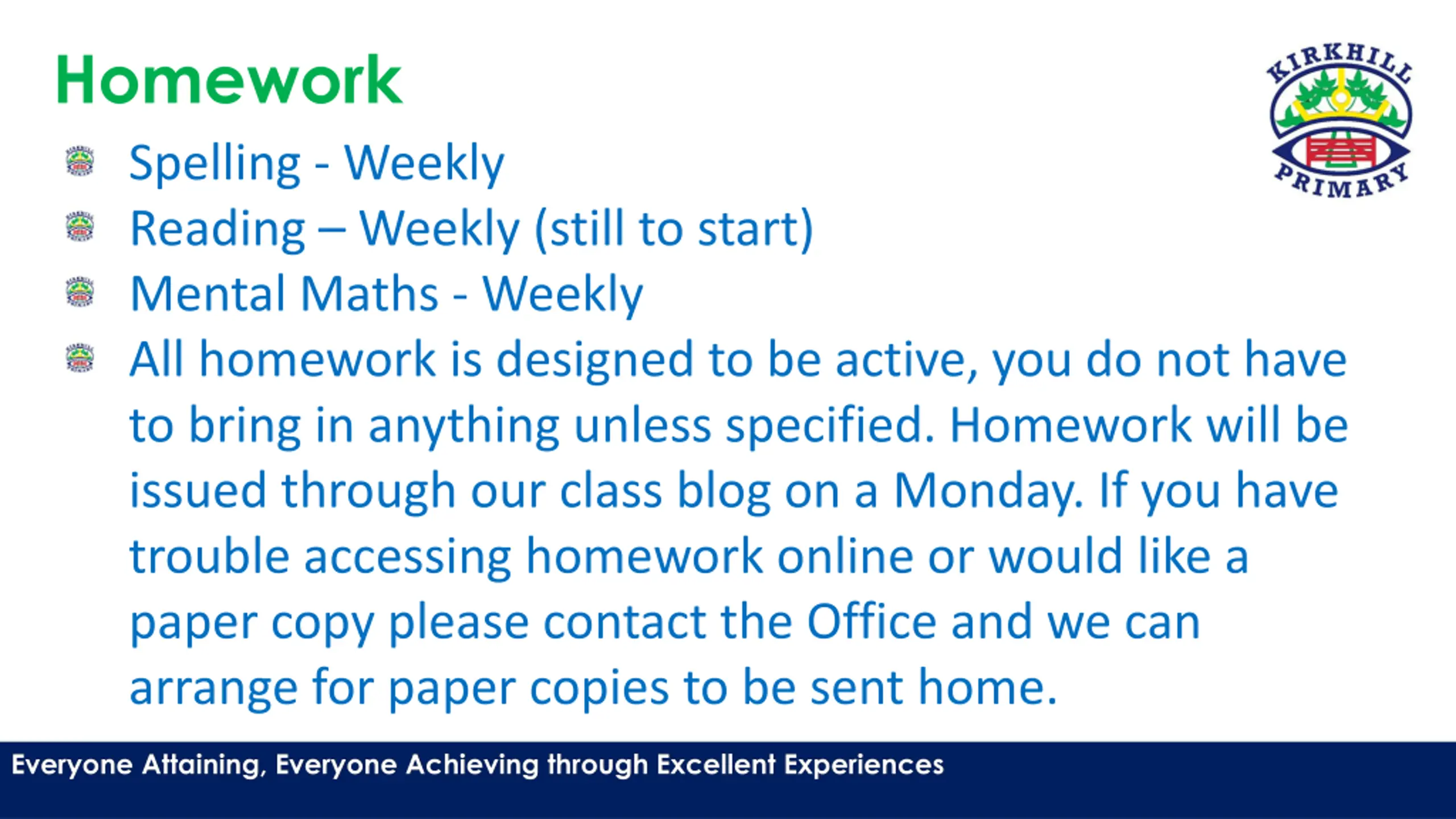 Homework Spelling - Weekly Reading Weekly (still to start) Mental Maths - Weekly All homework is designed to be active, you do not have to bring in anything unless specified. Homework will be issued through our class blog on a Monday. If you have trouble accessing homework online or would like a paper copy please contact the Office and we can arrange for paper copies to be sent home. Everyone Attaining, Everyone Achieving through Excellent Experiences