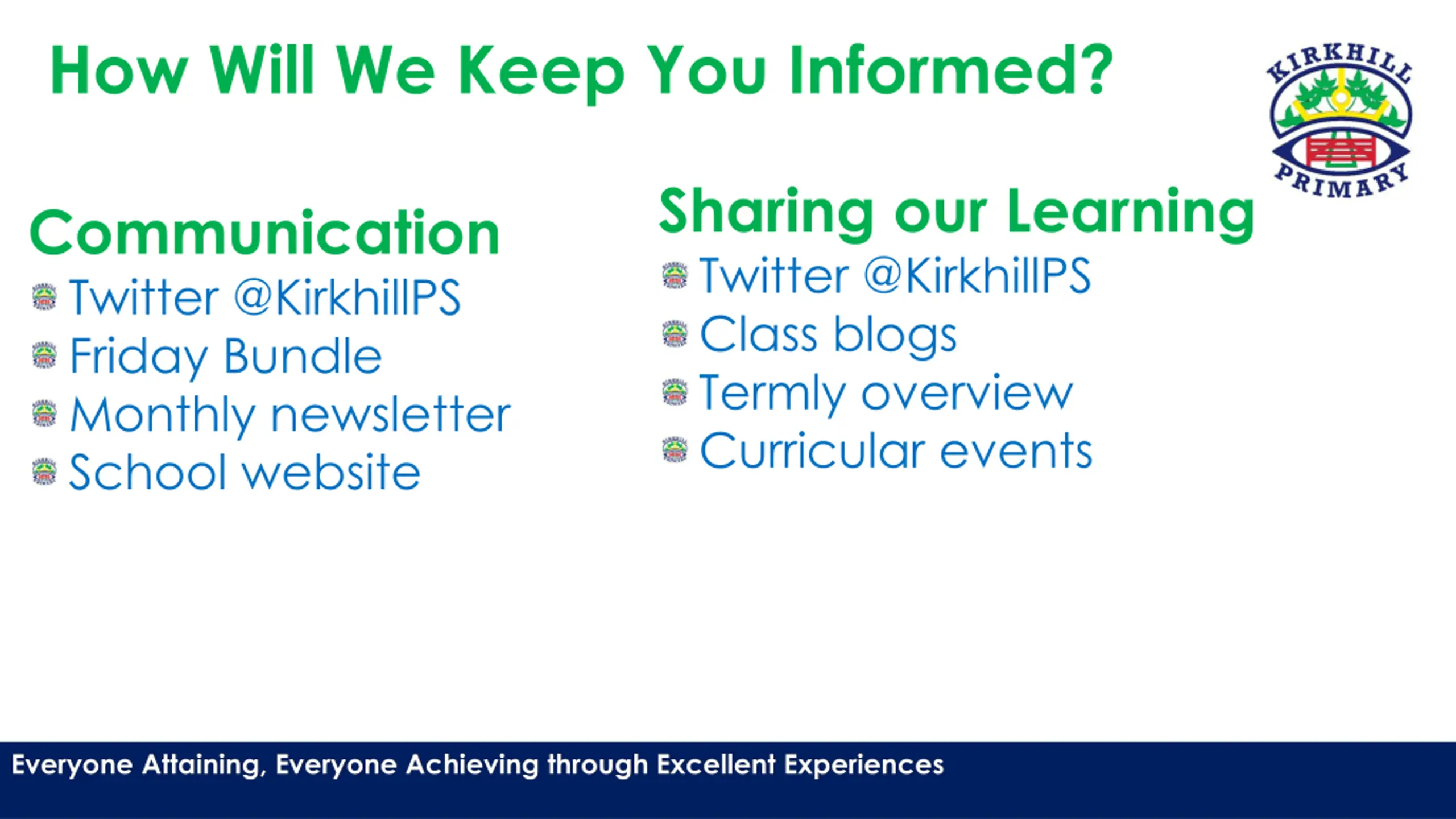 How Will We Keep You Informed? Sharing our Learning Twitter @KirkhillPS Class blogs Termly overview Curricular events Communication Twitter @KirkhillPS Friday Bundle Monthly newsletter School website Everyone Attaining, Everyone Achieving through Excellent Experiences