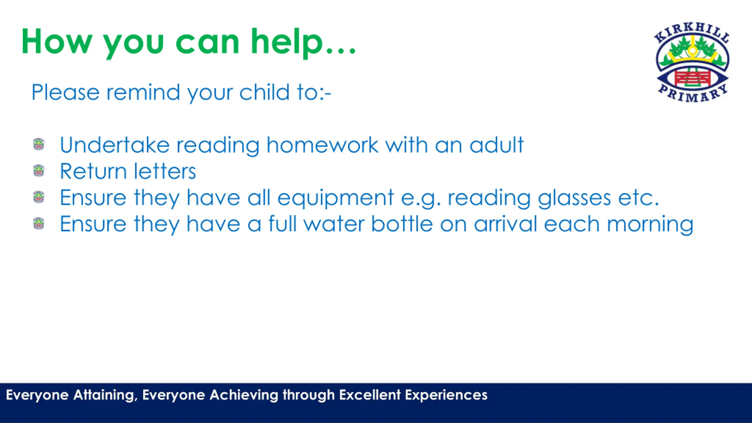 How you can help Please remind your child to:- Undertake reading homework with an adult Return letters Ensure they have all equipment e.g. reading glasses etc. Ensure they have a full water bottle on arrival each morning Everyone Attaining, Everyone Achieving through Excellent Experiences
