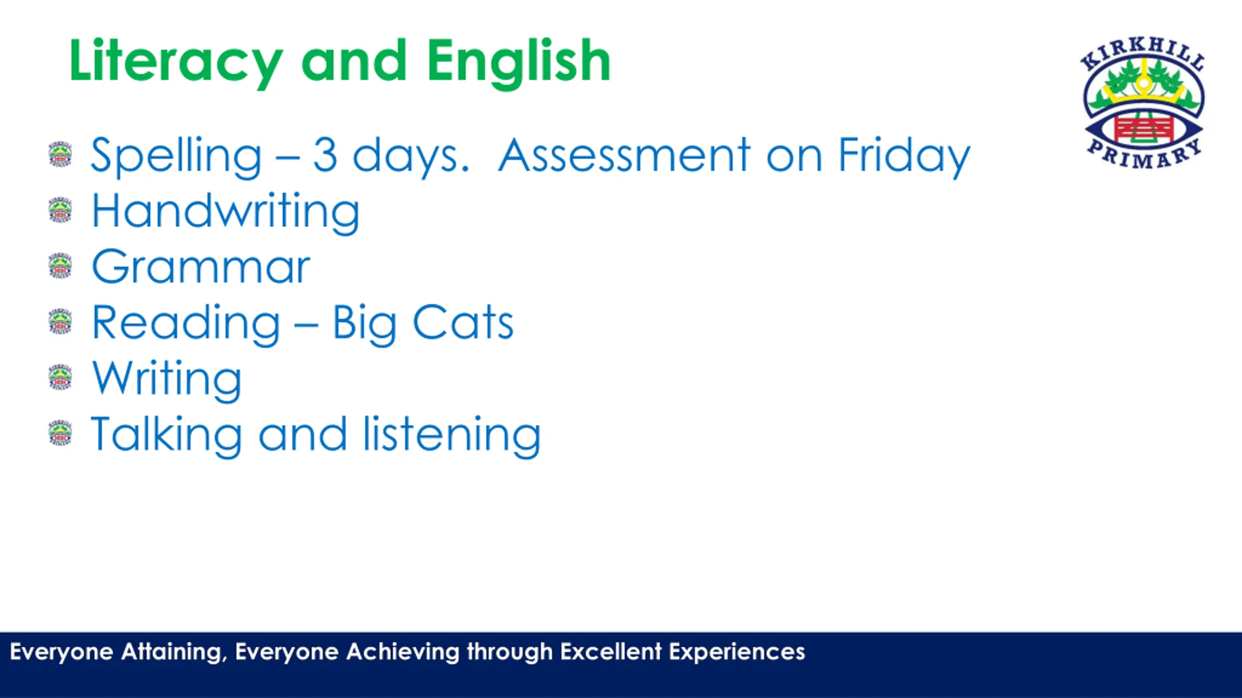 Literacy and English Spelling 3 days. Assessment on Friday Handwriting Grammar Reading Big Cats Writing Talking and listening Everyone Attaining, Everyone Achieving through Excellent Experiences