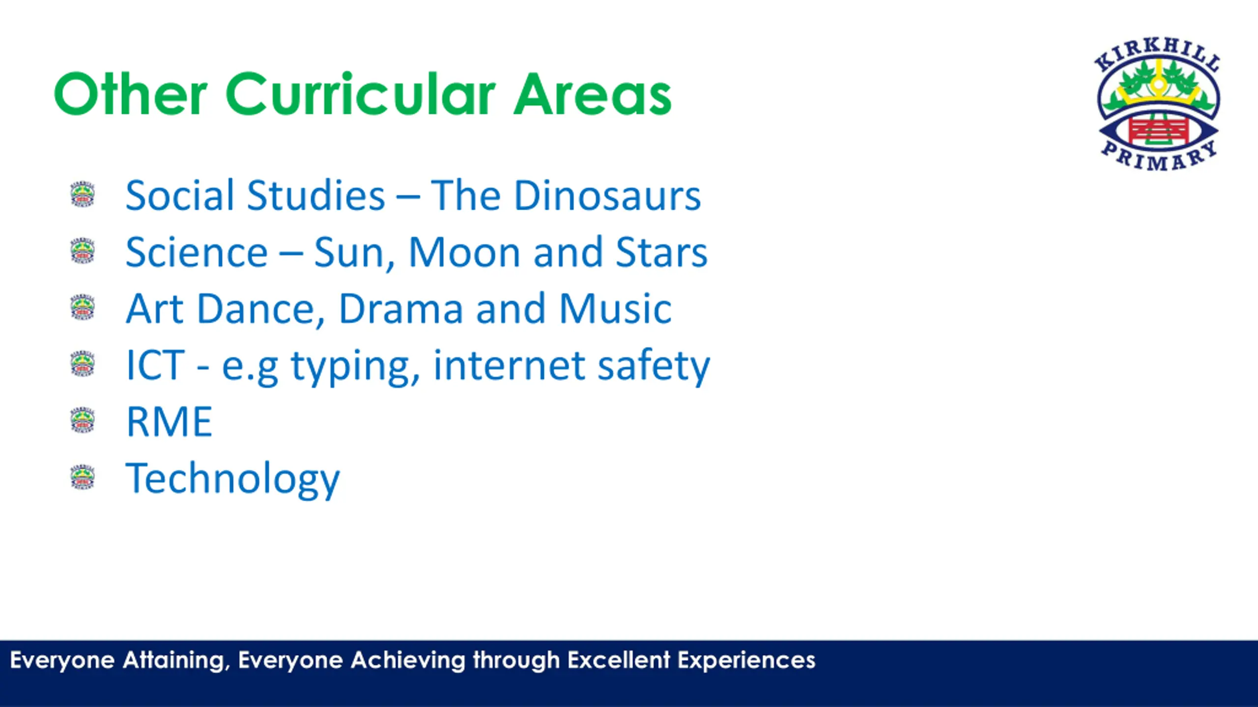 Other Curricular Areas Social Studies The Dinosaurs Science Sun, Moon and Stars Art Dance, Drama and Music ICT - e.g typing, internet safety RME Technology Everyone Attaining, Everyone Achieving through Excellent Experiences