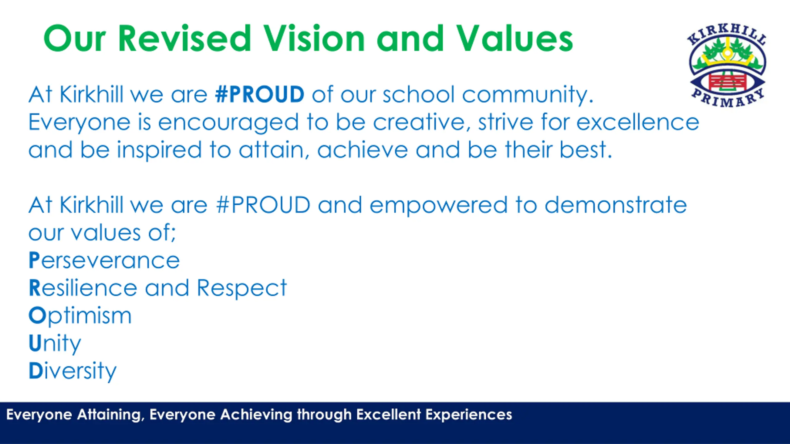 Our Revised Vision and Values At Kirkhill we are #PROUD of our school community. Everyone is encouraged to be creative, strive for excellence and be inspired to attain, achieve and be their best. At Kirkhill we are #PROUD and empowered to demonstrate our values of; Perseverance Resilience and Respect Optimism Unity Diversity Everyone Attaining, Everyone Achieving through Excellent Experiences