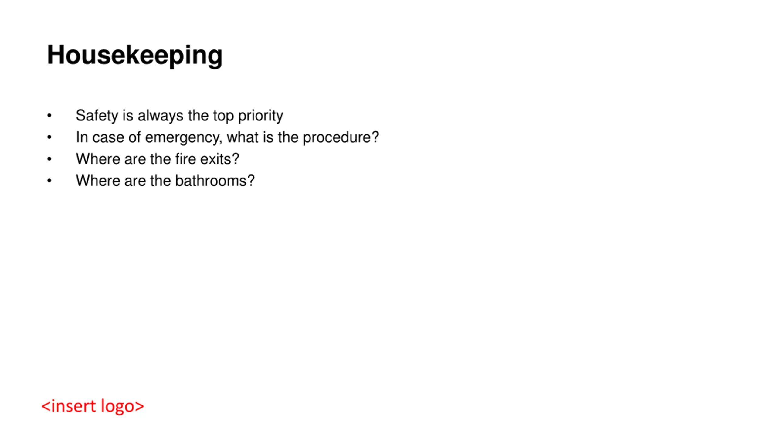 Housekeeping Safety is always the top priority In case of emergency, what is the procedure? Where are the fire exits? Where are the bathrooms? <insert logo>