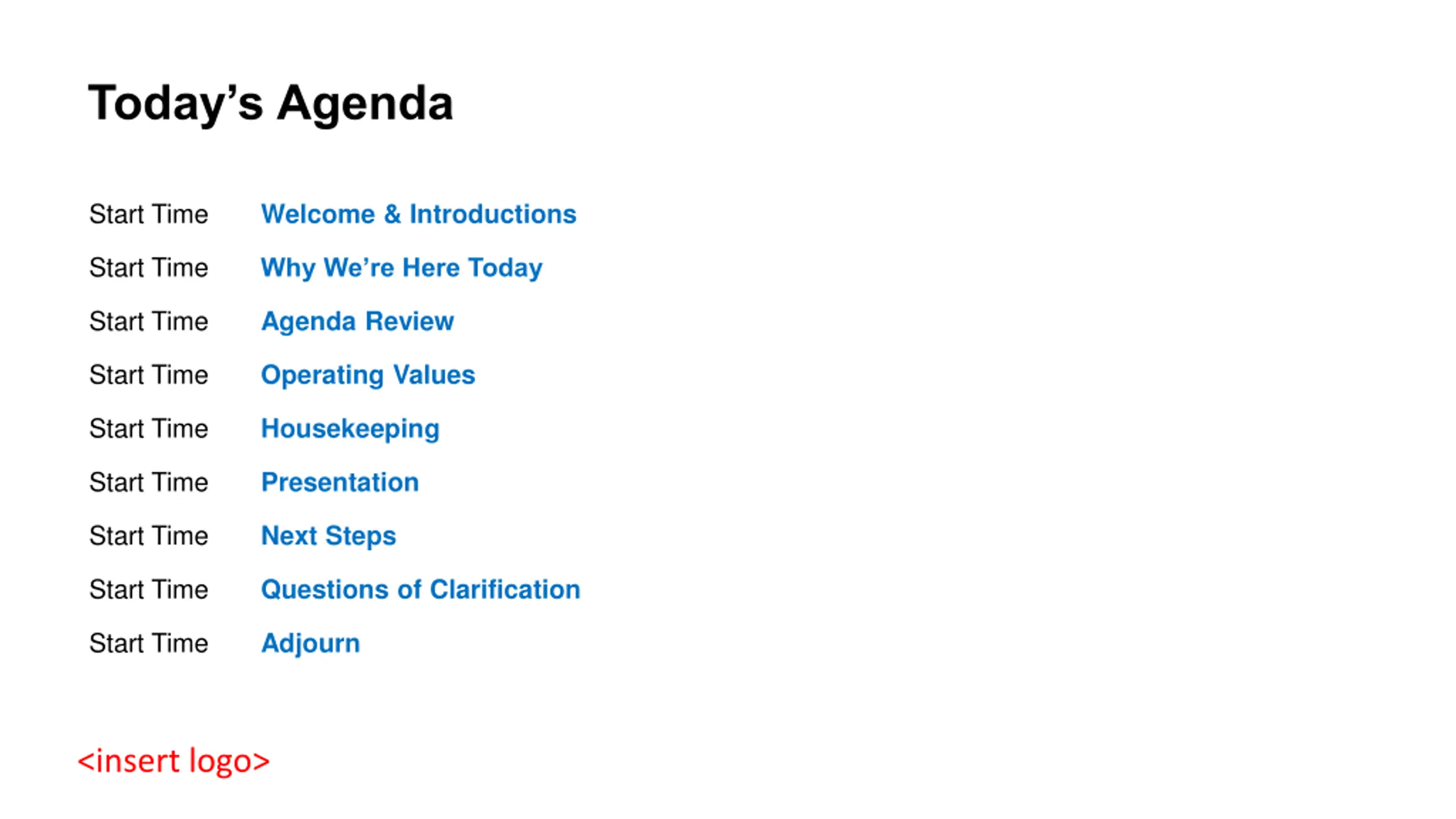 Todays Agenda Start Time Welcome & Introductions Start Time Why We re Here Today Start Time Agenda Review Start Time Operating Values Start Time Housekeeping Start Time Presentation Start Time Next Steps Start Time Questions of Clarification Start Time Adjourn <insert logo>
