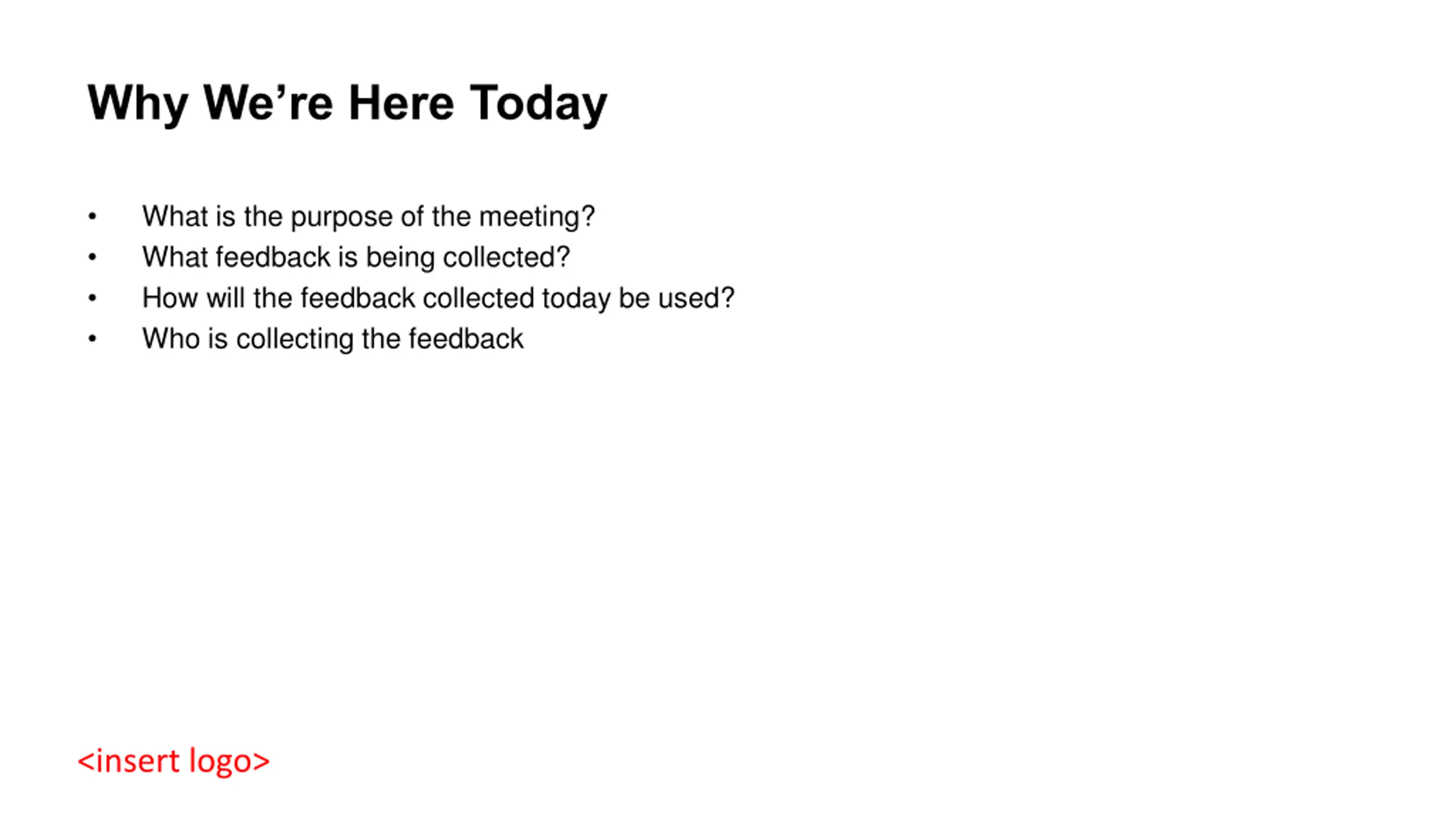Why Were Here Today What is the purpose of the meeting? What feedback is being collected? How will the feedback collected today be used? Who is collecting the feedback <insert logo>