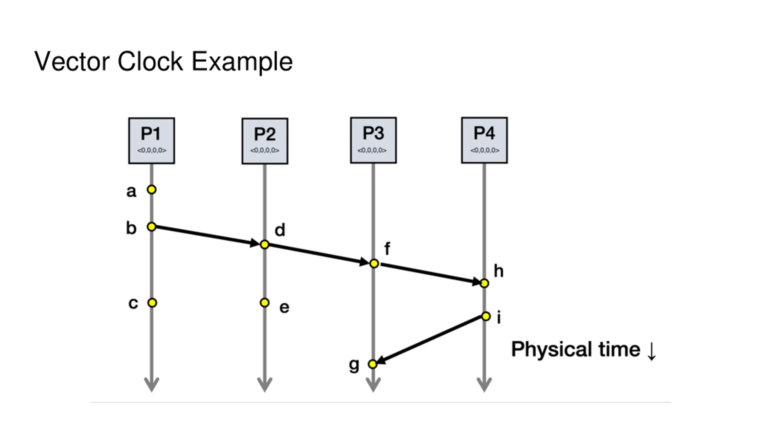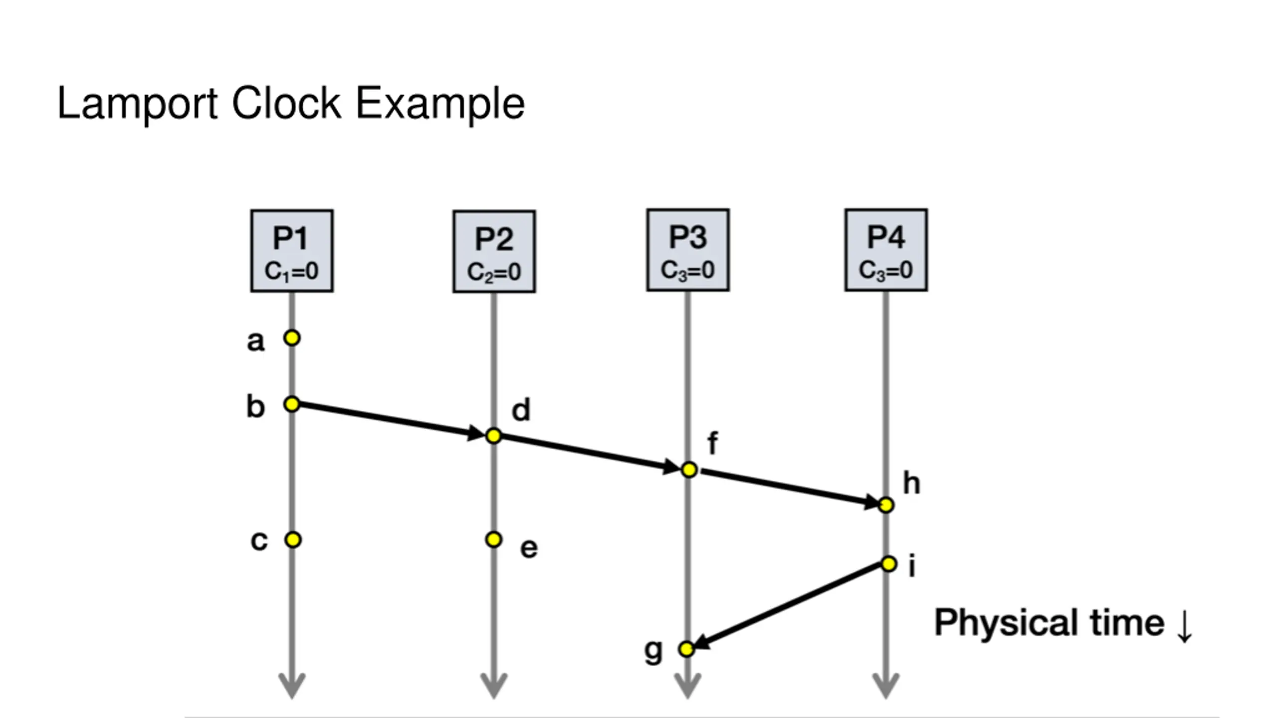 Lamport Clock Algorithm 1. Before executing an event b, Ci = Ci + 1: 2. Set event time C(b) Ci 3. Send the local clock in the message m 4. On process Pj receiving a message m: 5. Set Cj and receive event time C(c) 1 + max{ Cj, C(m) }