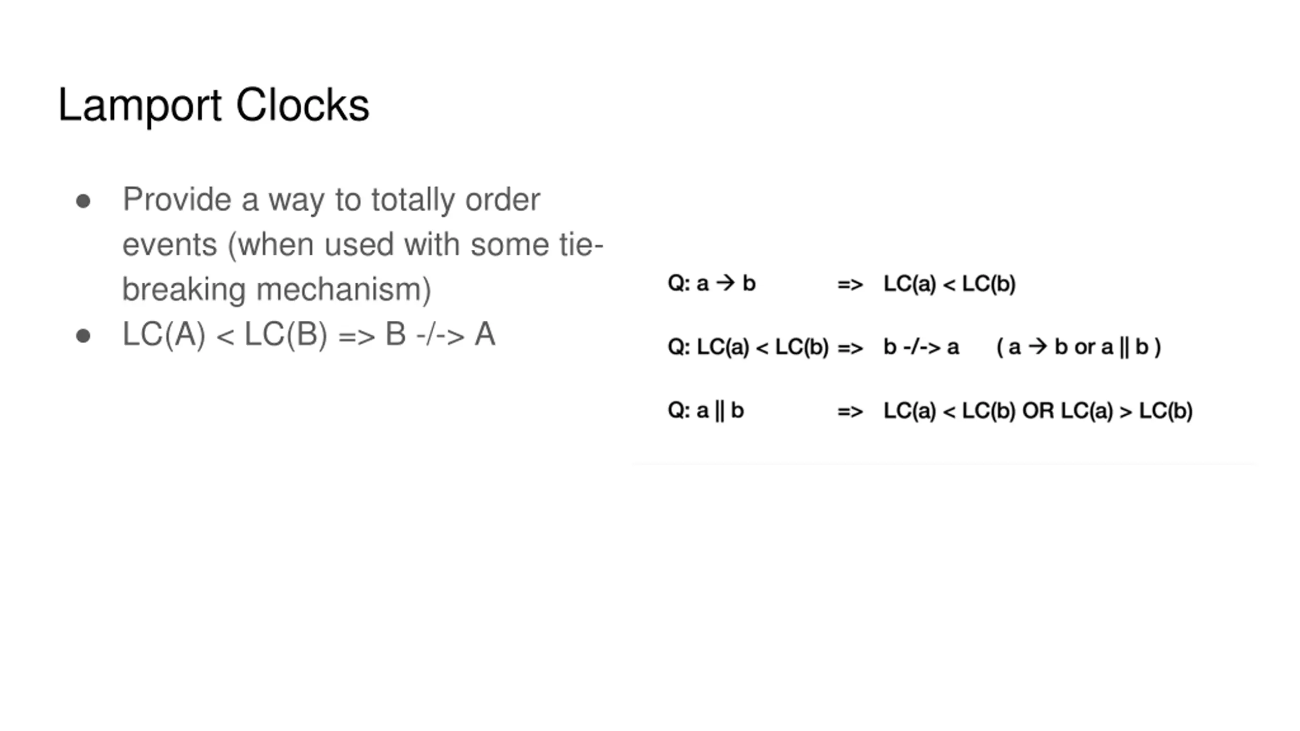 Lamport Clocks Provide a way to totally order events (when used with some tie- breaking mechanism) LC(A) < LC(B) => B -/-> A
