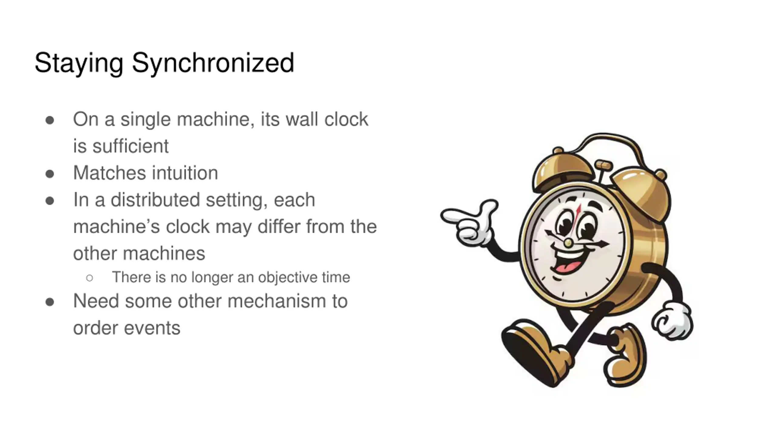 Staying Synchronized On a single machine, its wall clock is sufficient Matches intuition In a distributed setting, each machine s clock may differ from the other machines There is no longer an objective time Need some other mechanism to order events