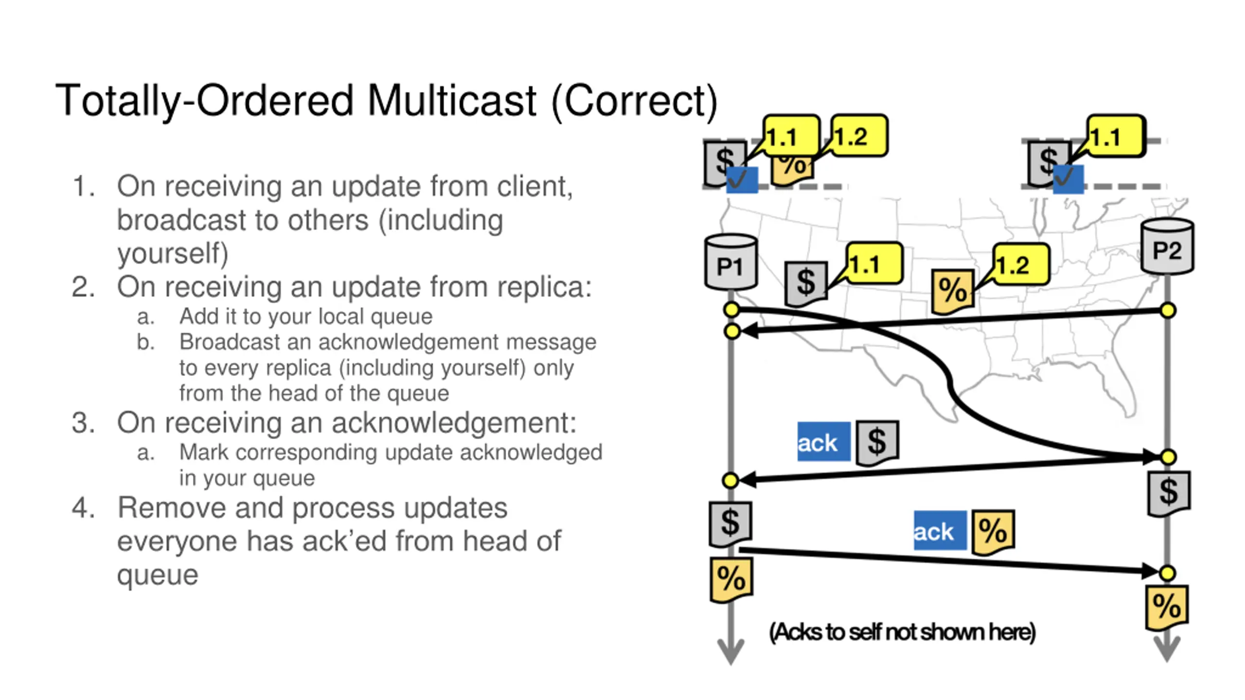 Totally-Ordered Multicast (Incorrect) 1. On receiving an update from client, broadcast to others (including yourself) 2. On receiving an update from replica: a. Add it to your local queue b. Broadcast an acknowledgement message to every replica (including yourself) 3. On receiving an acknowledgement: a. Mark corresponding update acknowledged in your queue 4. Remove and process updates everyone has ack ed from head of queue