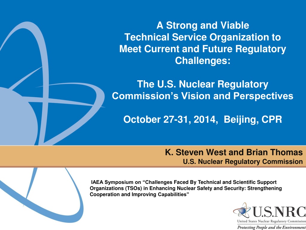 A Strong and Viable Technical Service Organization to Meet Current and Future Regulatory Challenges: The U.S. Nuclear Regulatory Commission s Vision and Perspectives October 27-31, 2014, Beijing, CPR K. Steven West and Brian Thomas U.S. Nuclear Regulatory Commission IAEA Symposium on Challenges Faced By Technical and Scientific Support Organizations (TSOs) in Enhancing Nuclear Safety and Security: Strengthening Cooperation and Improving Capabilities