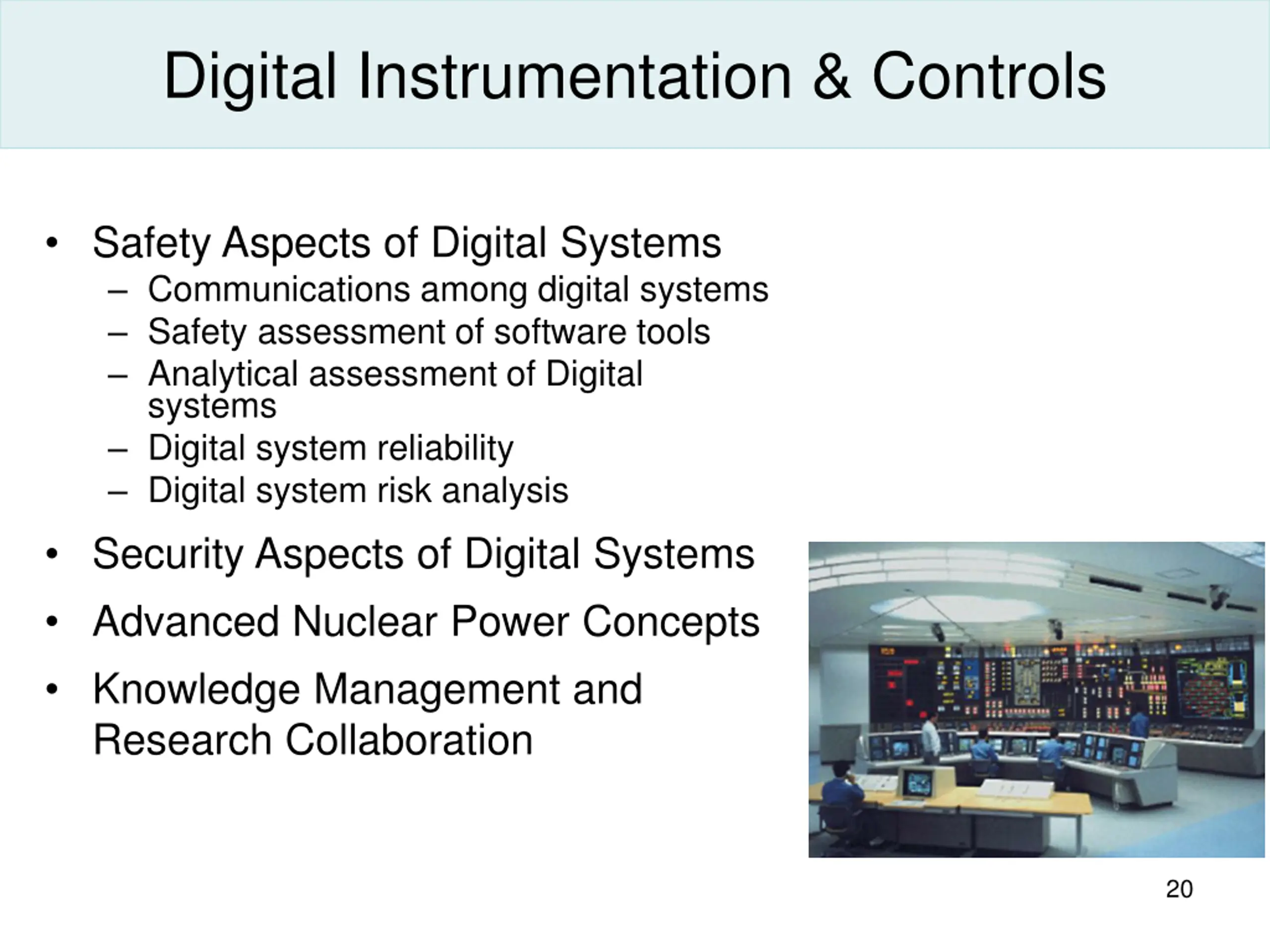 Digital Instrumentation & Controls Safety Aspects of Digital Systems Communications among digital systems Safety assessment of software tools Analytical assessment of Digital systems Digital system reliability Digital system risk analysis Security Aspects of Digital Systems Advanced Nuclear Power Concepts Knowledge Management and Research Collaboration 20