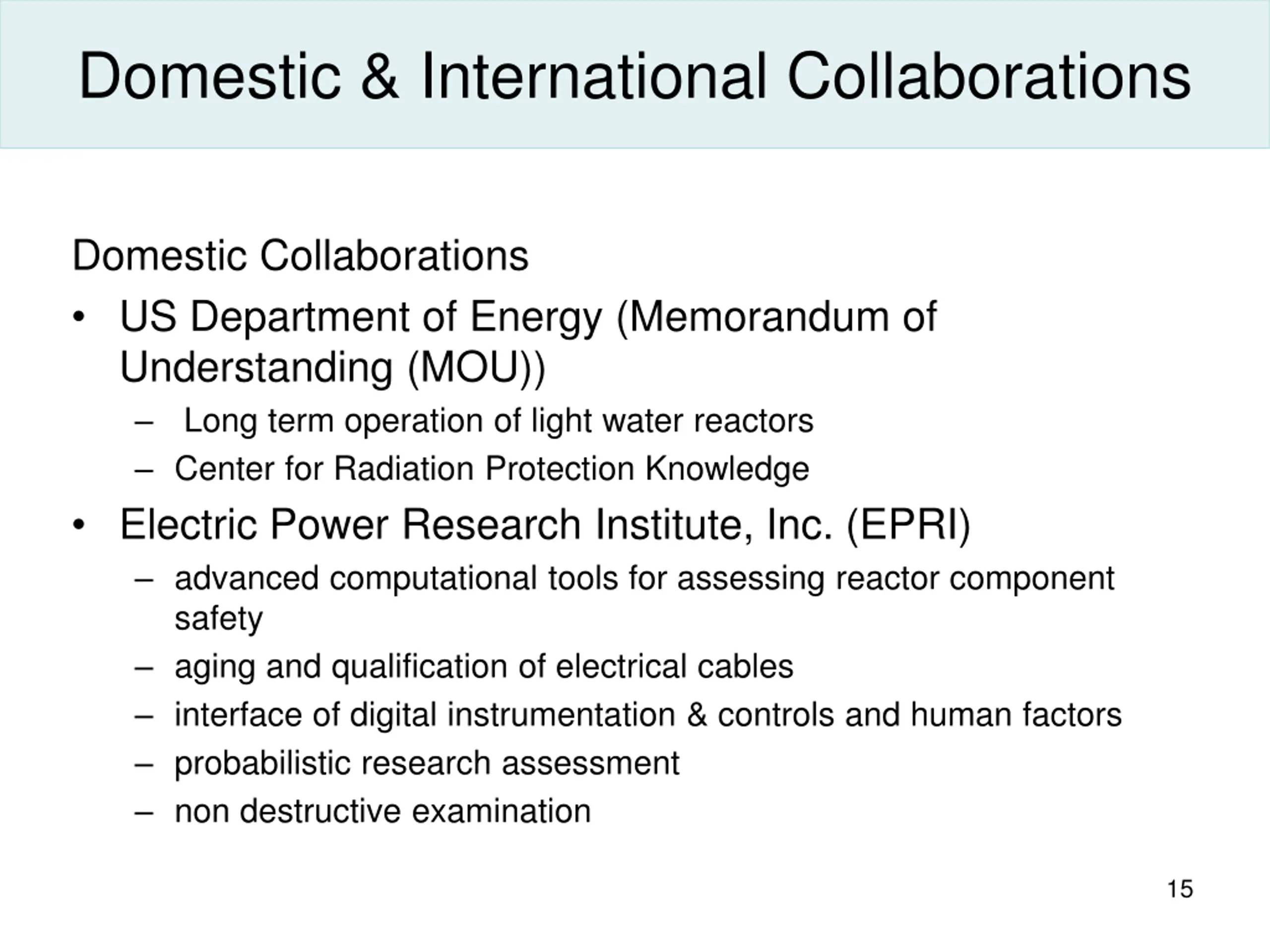 Domestic & International Collaborations Domestic Collaborations US Department of Energy (Memorandum of Understanding (MOU)) Long term operation of light water reactors Center for Radiation Protection Knowledge Electric Power Research Institute, Inc. (EPRI) advanced computational tools for assessing reactor component safety aging and qualification of electrical cables interface of digital instrumentation & controls and human factors probabilistic research assessment non destructive examination 15
