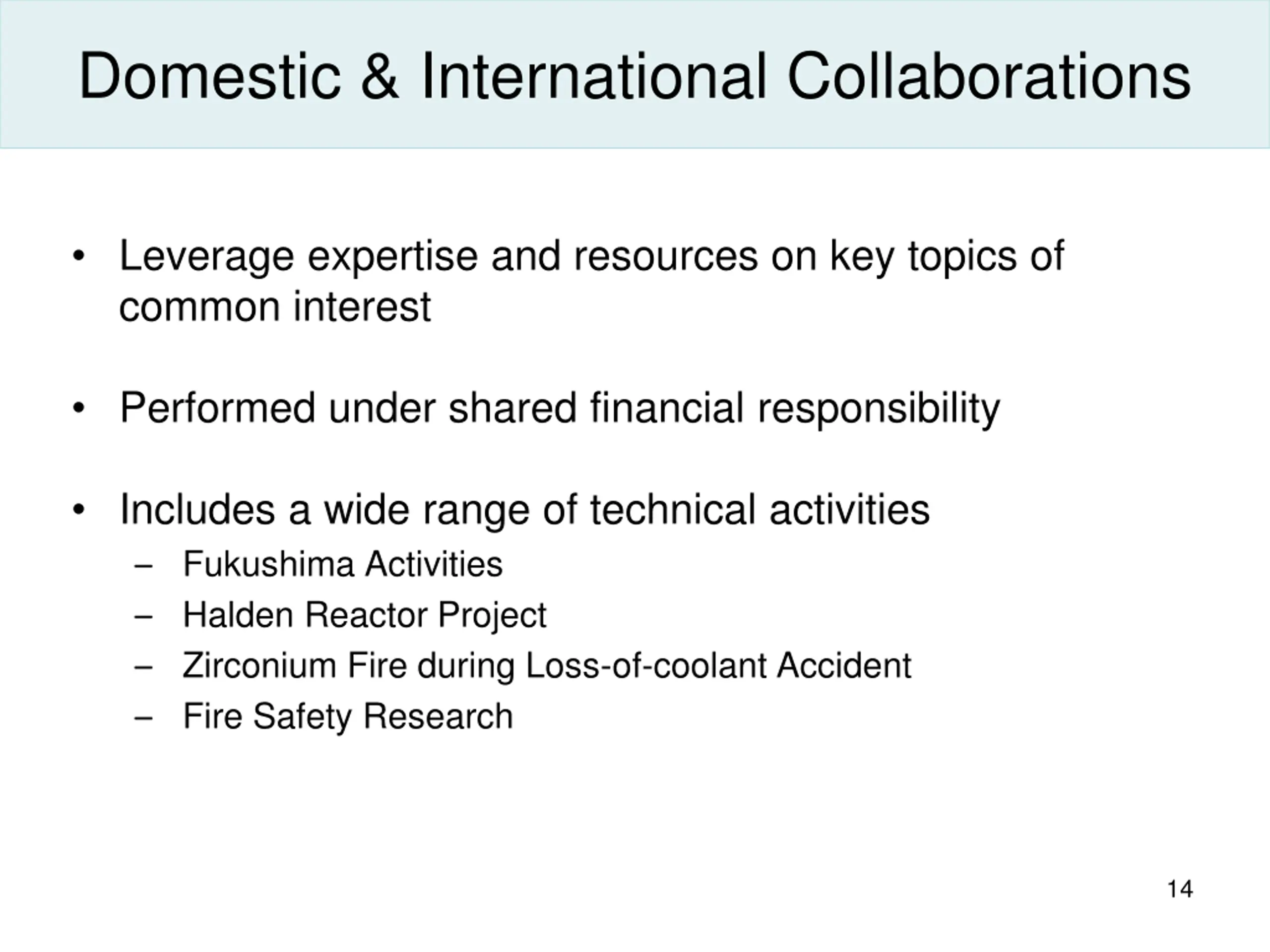 Domestic & International Collaborations Leverage expertise and resources on key topics of common interest Performed under shared financial responsibility Includes a wide range of technical activities Fukushima Activities Halden Reactor Project Zirconium Fire during Loss-of-coolant Accident Fire Safety Research 14