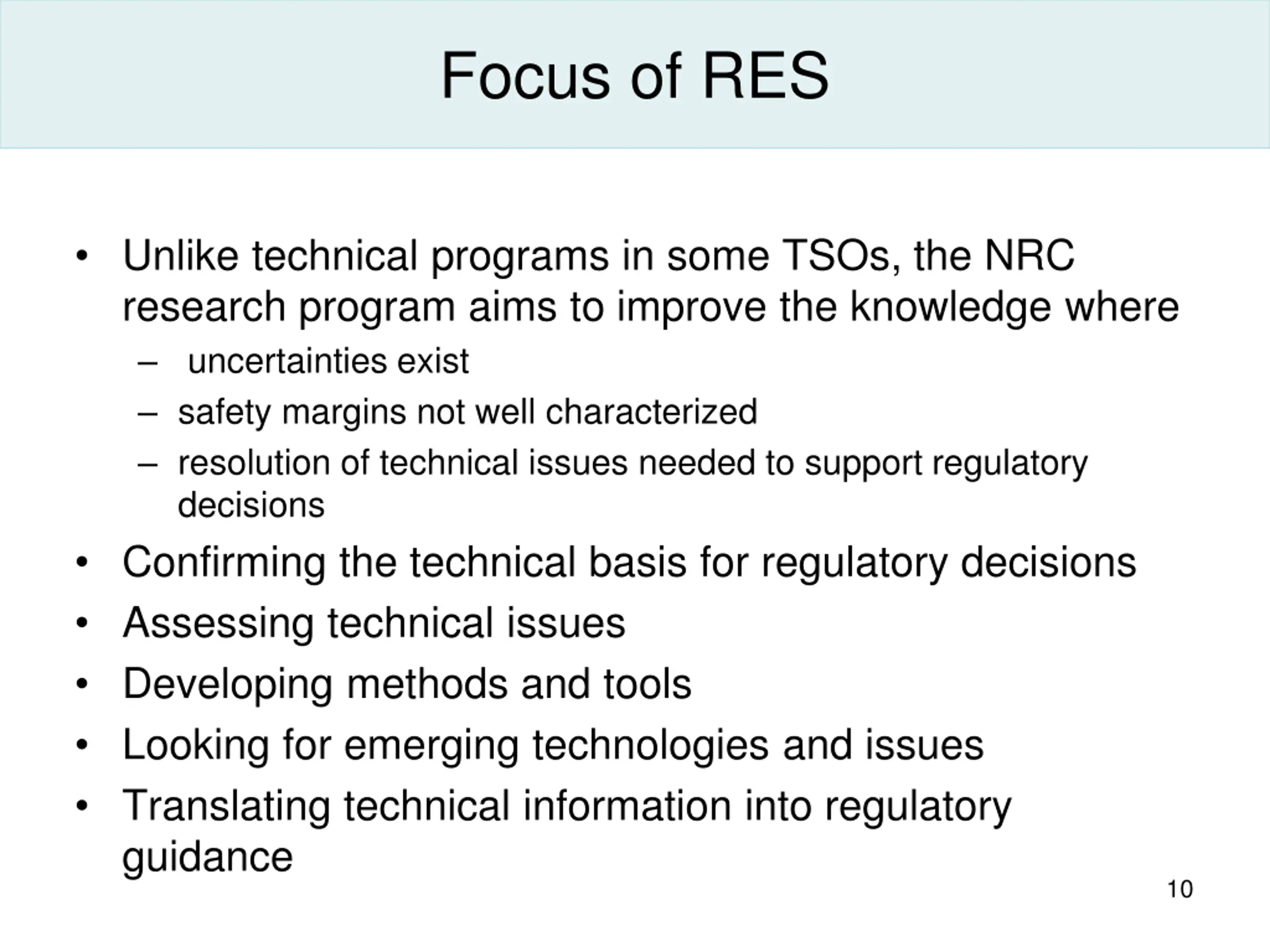 Role of RES Plans, recommends, and implements research programs NRC performs confirmatory research to support decisions about the adequacy of safety or security of a regulated function Licensees and applicants have the primary responsibility to develop data to support their safety analyses and applications NRC does not conduct development research designed to improve plant performance Standards development Coordinates NRC Participation international standards and national standards, including appointment of staff to committees Resolution of generic safety issues NRC does research to determine if a safety issue exists NRC conducts confirmatory research to independently verify licensee or applicant s data, determine safety margins, and explore uncertainties 9